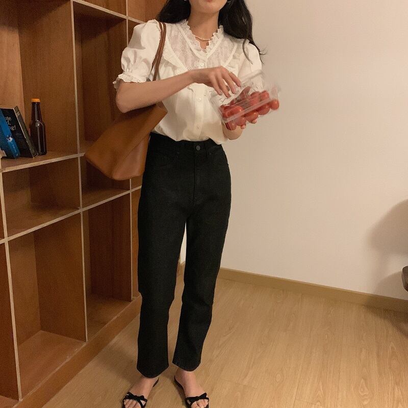 トップス サマーVネックスタンダードレーススタイル刺繍スリーブホワイトシャツ レトロ 夏物 ステッチ 韓国婦人12270884968