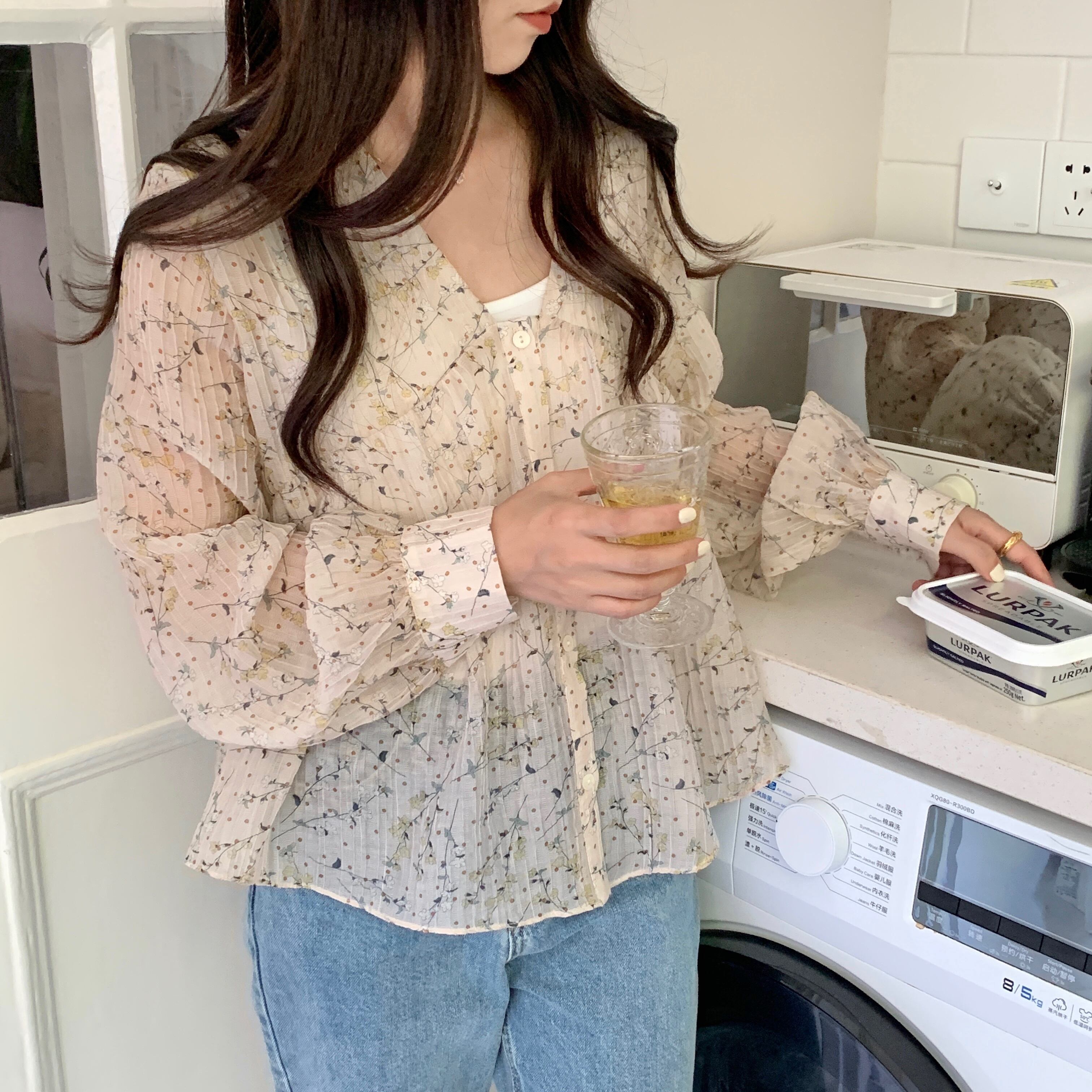 サマースタンダードプリーツシャツ フローラルシフォンレディース レトロ 夏物 花柄 韓国婦人90586377309