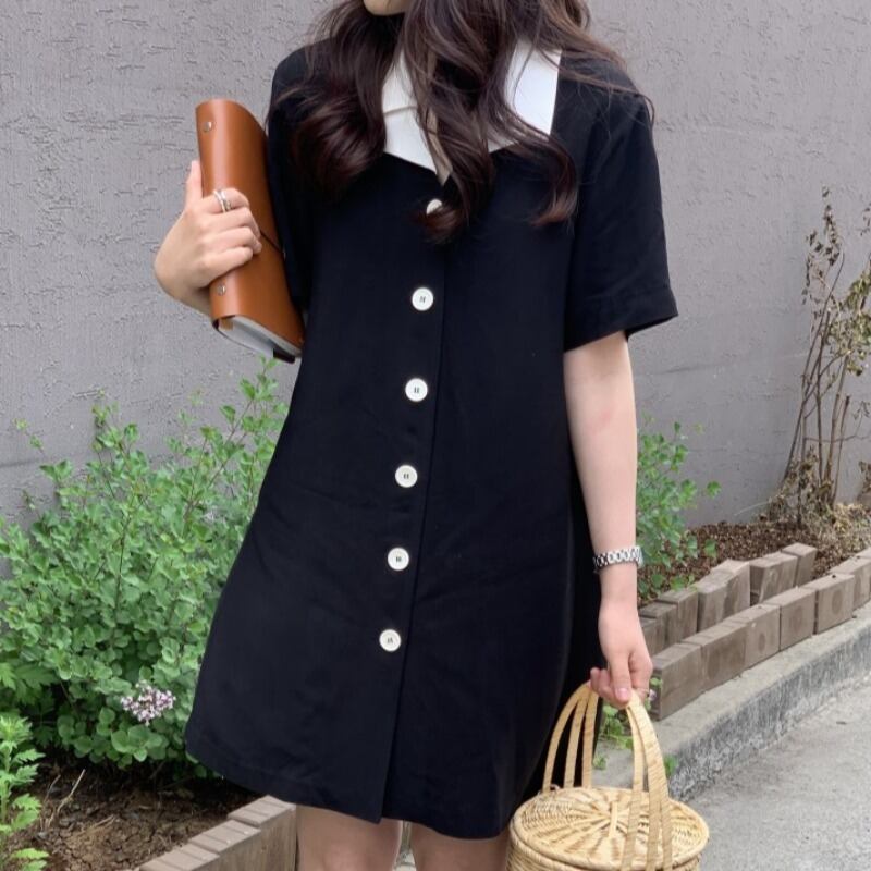 スタンダードカラールーズブラックドレス スタイルスカート サマー レトロ 夏物 韓国婦人16943707427