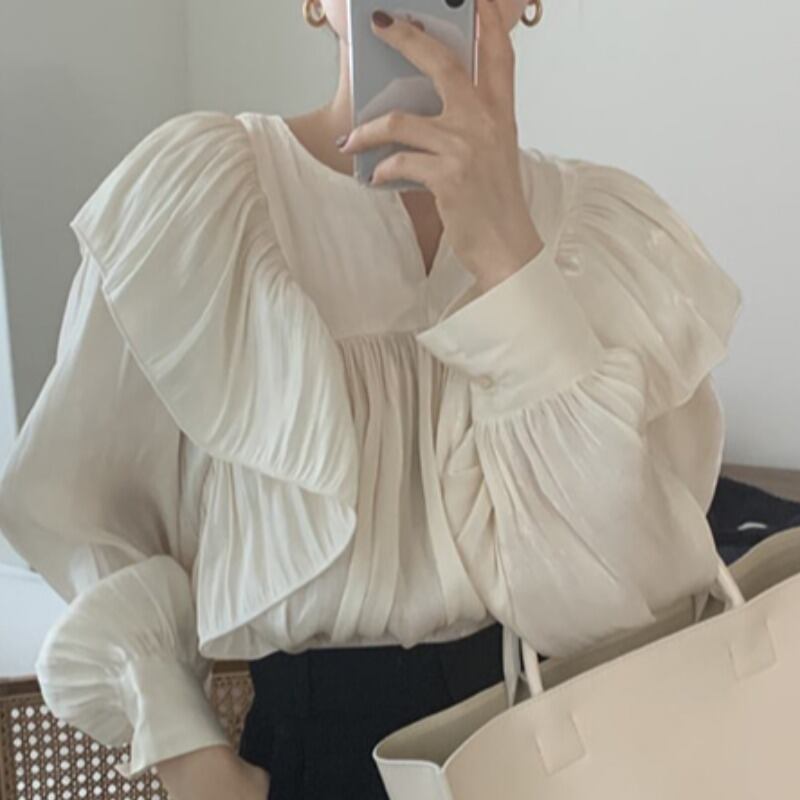 カラースリーブシャツ スタンダードスタイルルーズブラウス レディース ランタンスリーブ レトロ 韓国婦人8919813060