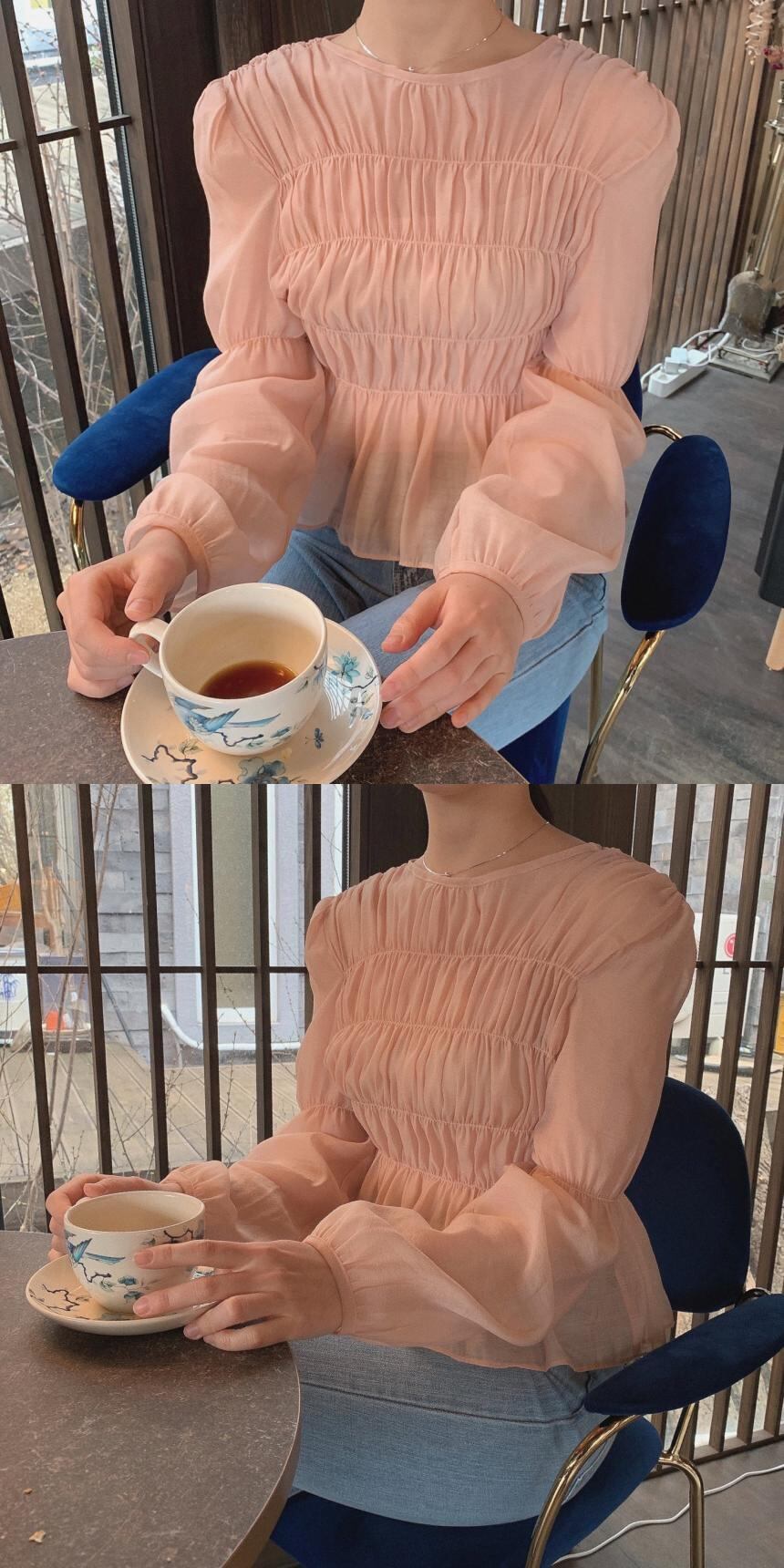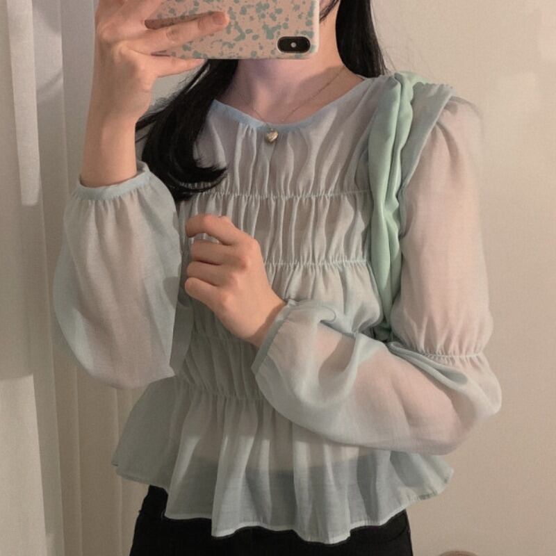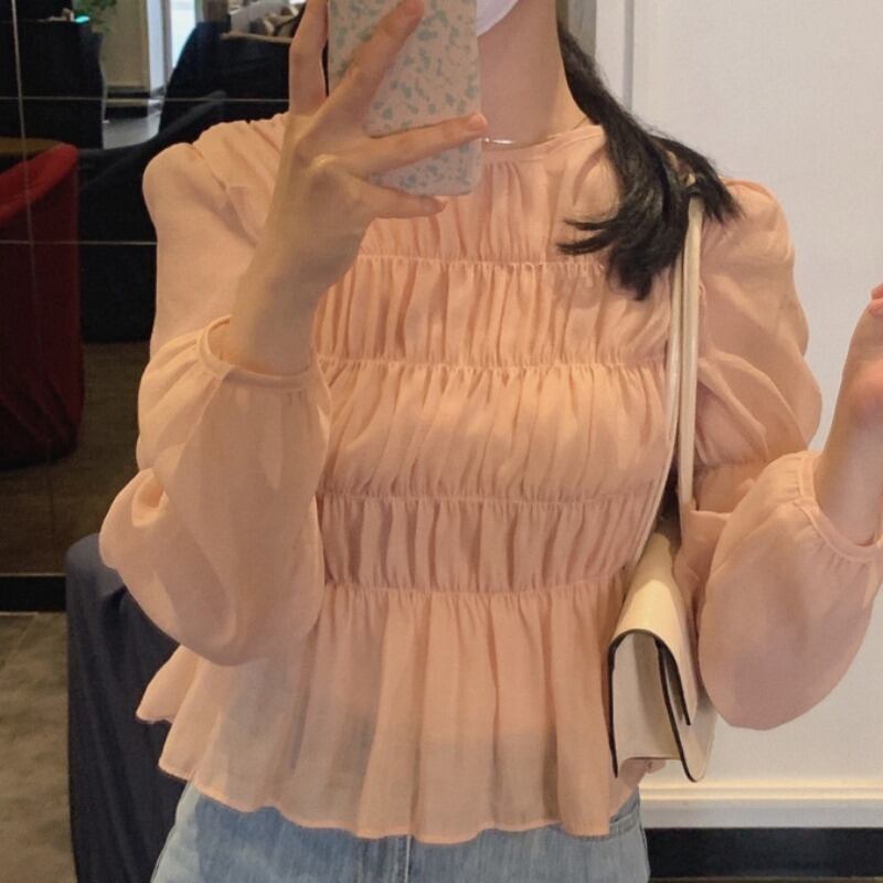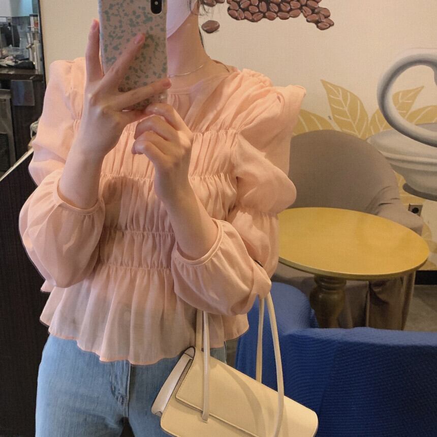 シフォンシャツ レディースサマーラウンドネックプリーツウェストトップス ロング 夏物 Oネック 韓国婦人64580513408