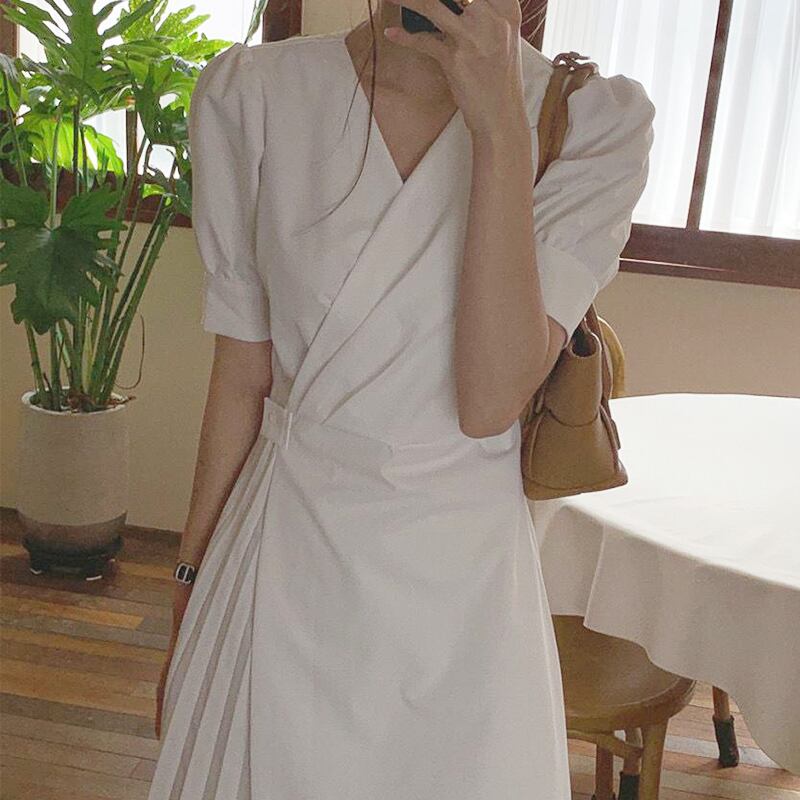 ワンピーススリーブサマープリーツロング エレガント 夏物 スカート Vネック 韓国婦人95972821900