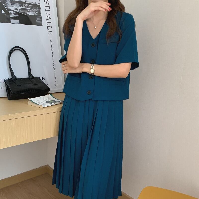 サマーVネックカジュアルジャケット ハイウェストプリーツスカート レディース 夏物 韓国婦人42227122636