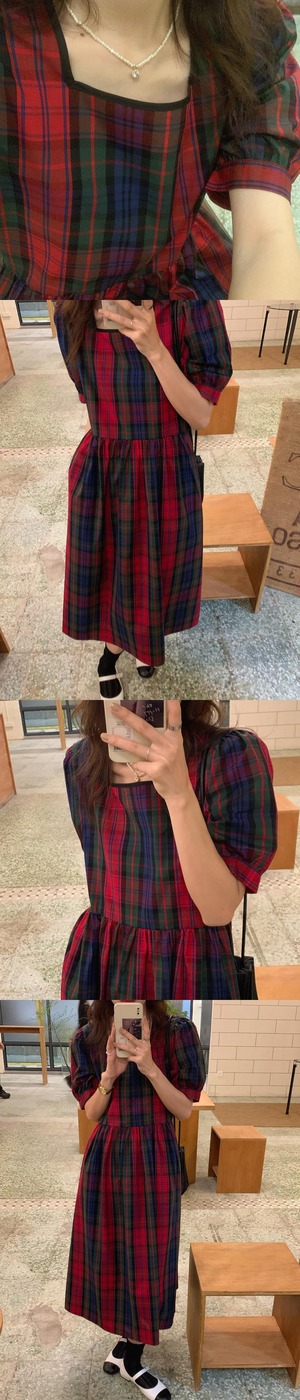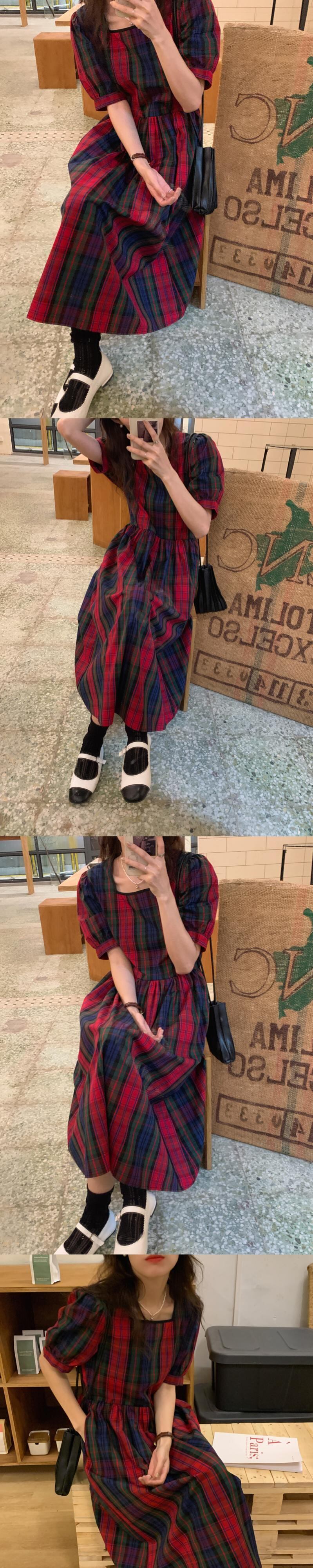 カラーウェストルーズスリーブドレス スタンダード格子柄Aラインロングスカート サマー レトロ 夏物 スクウェア 韓国婦人15159968940