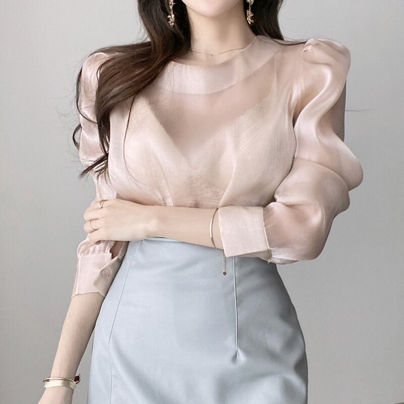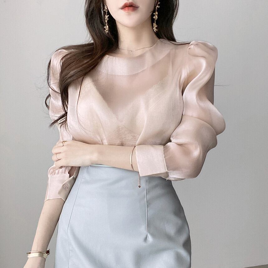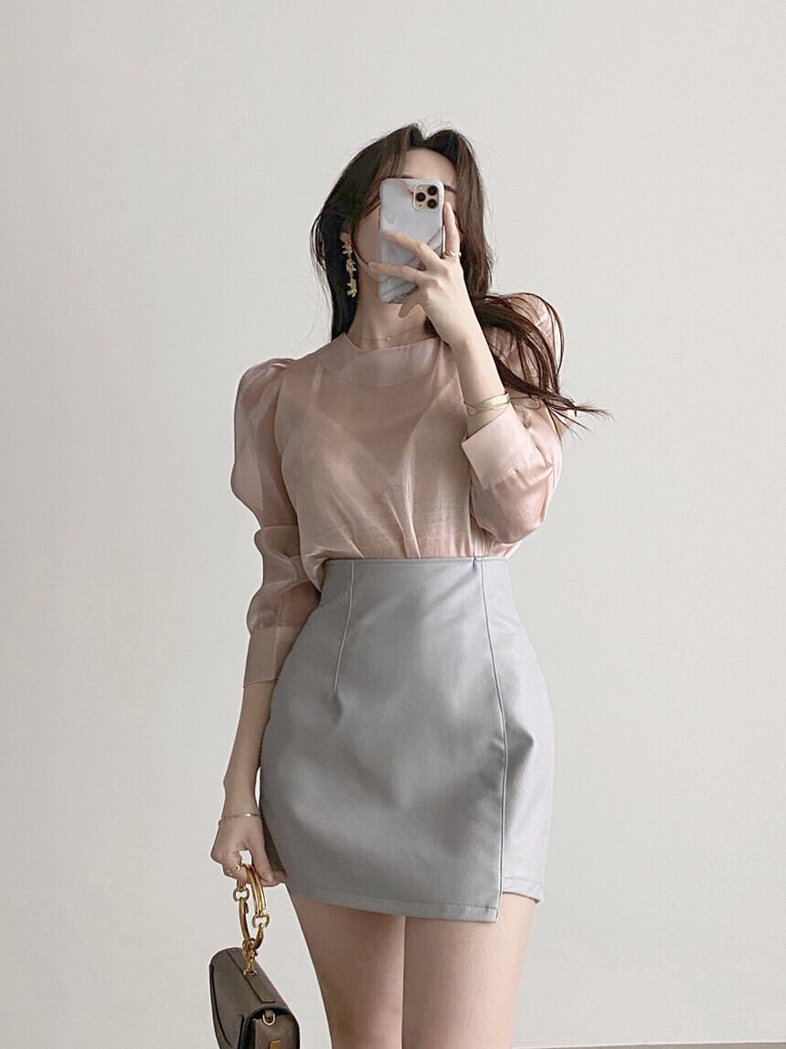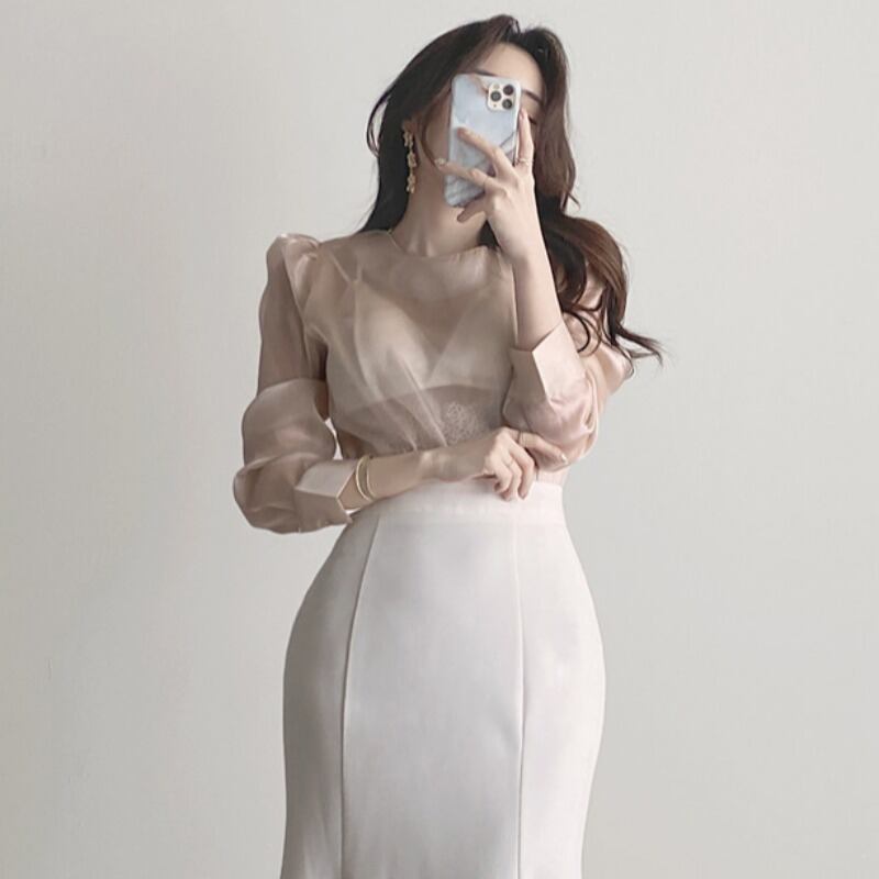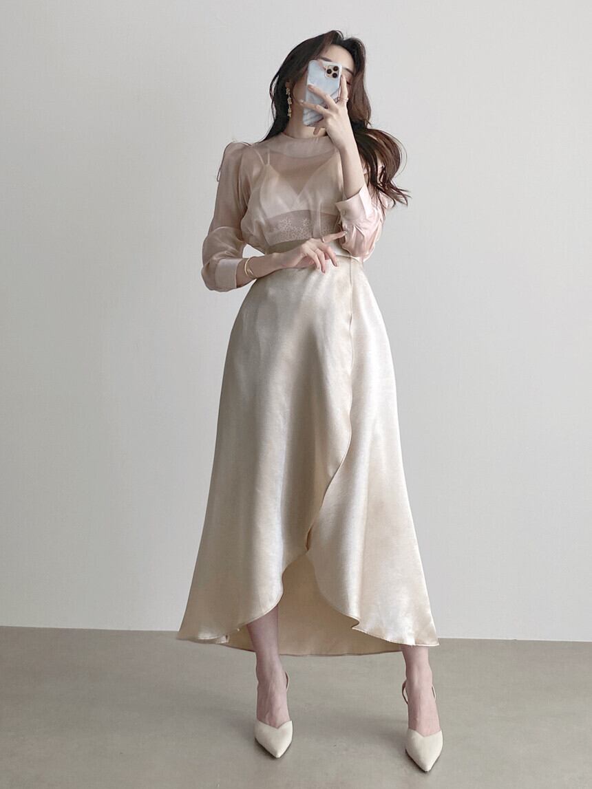スタンダードスリーブシャツ ハイウェストウェストスカート ランタンスリーブ レトロ シルク 韓国婦人712656849