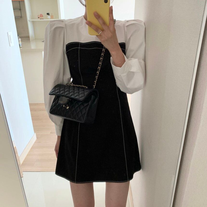 ラウンドネックブラックホワイトカラールーズスリーブドレス ショートスカート Oネック ステッチ 韓国婦人31693191617