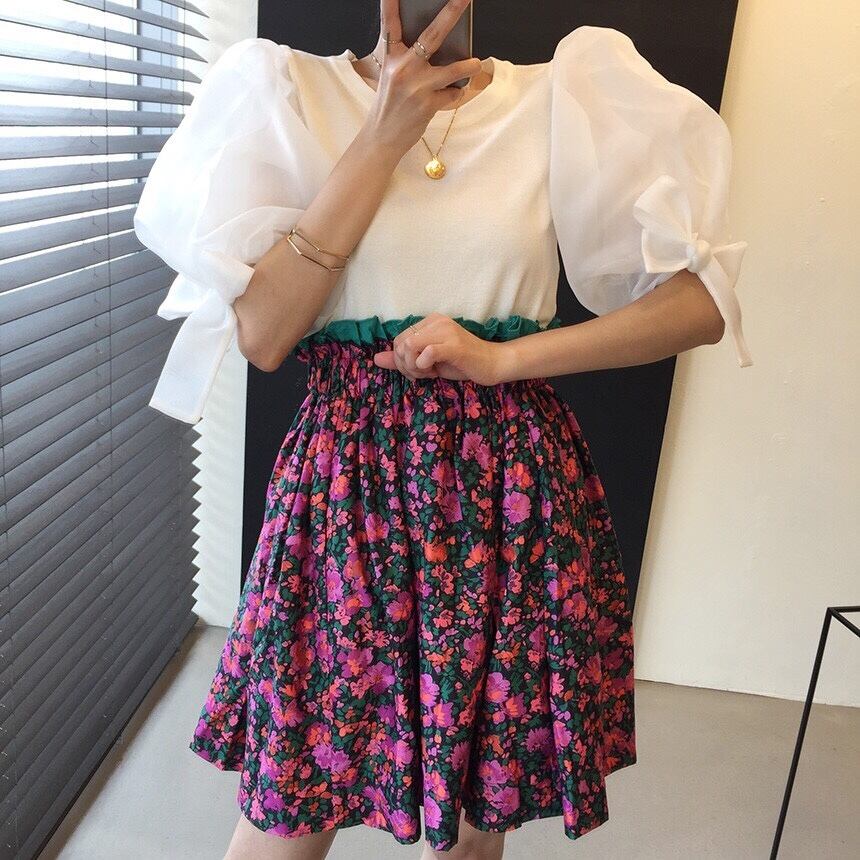 サマースリーブセーター スタンダードハイウェストウェストフローラルスカート レトロ 夏物 花柄 韓国婦人71289540883