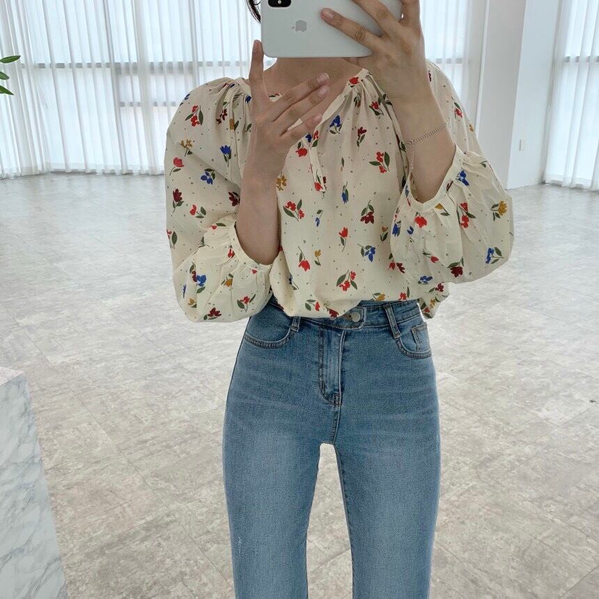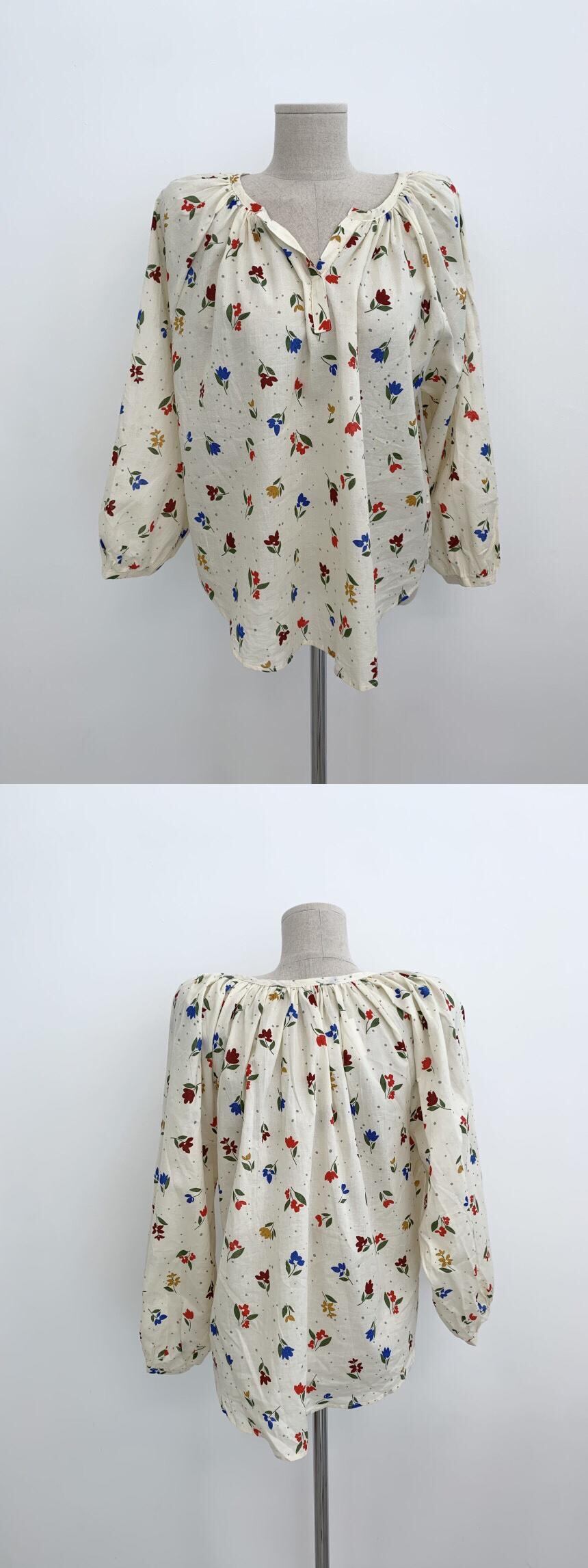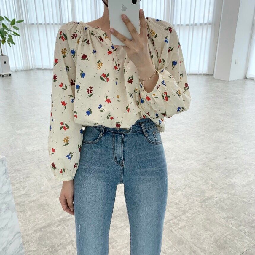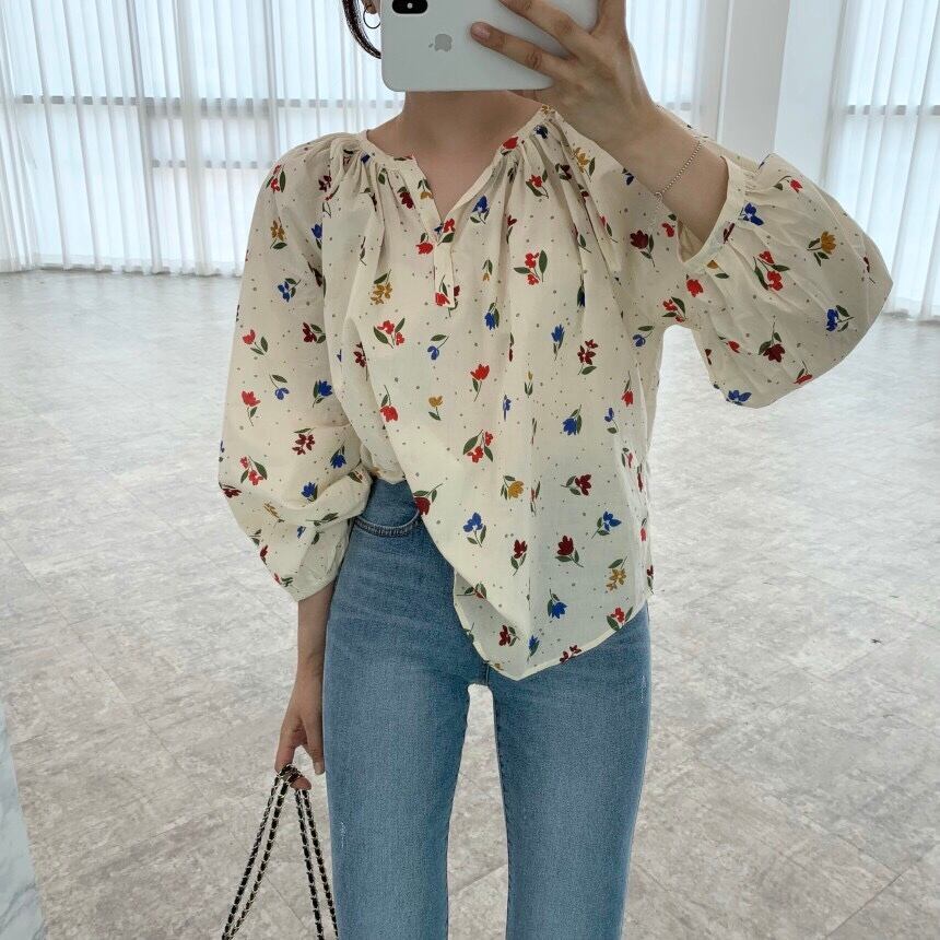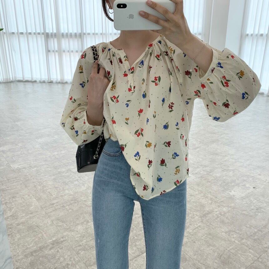 サマースリーブルーズフローラルVネックシャツ 大人ガーリー スウィート キュート カジュアル 夏物 花柄 韓国婦人71940195362