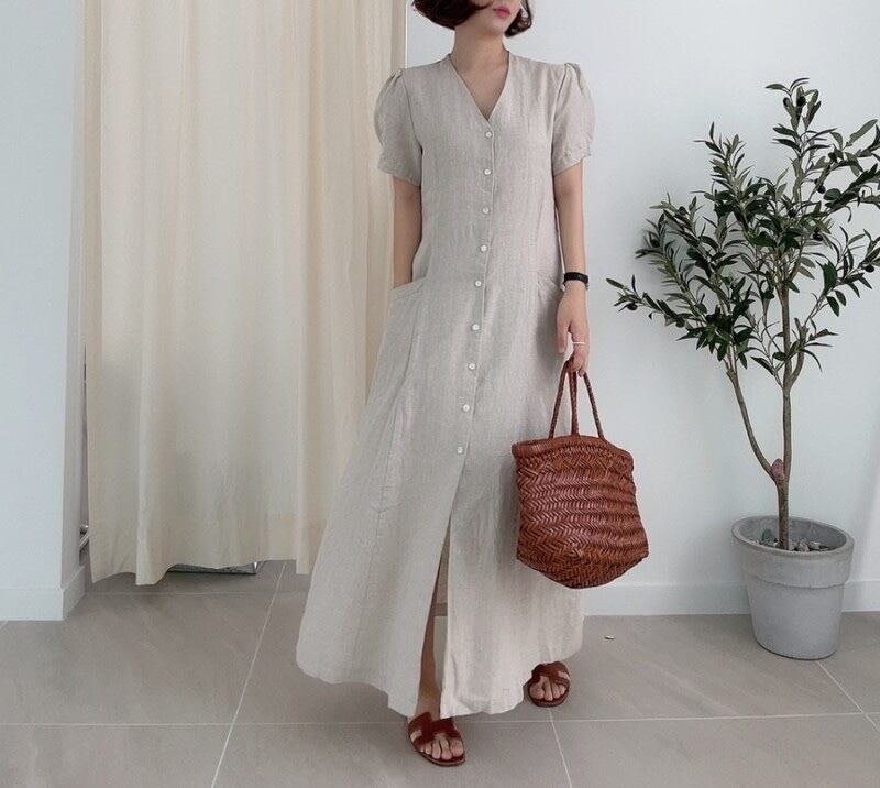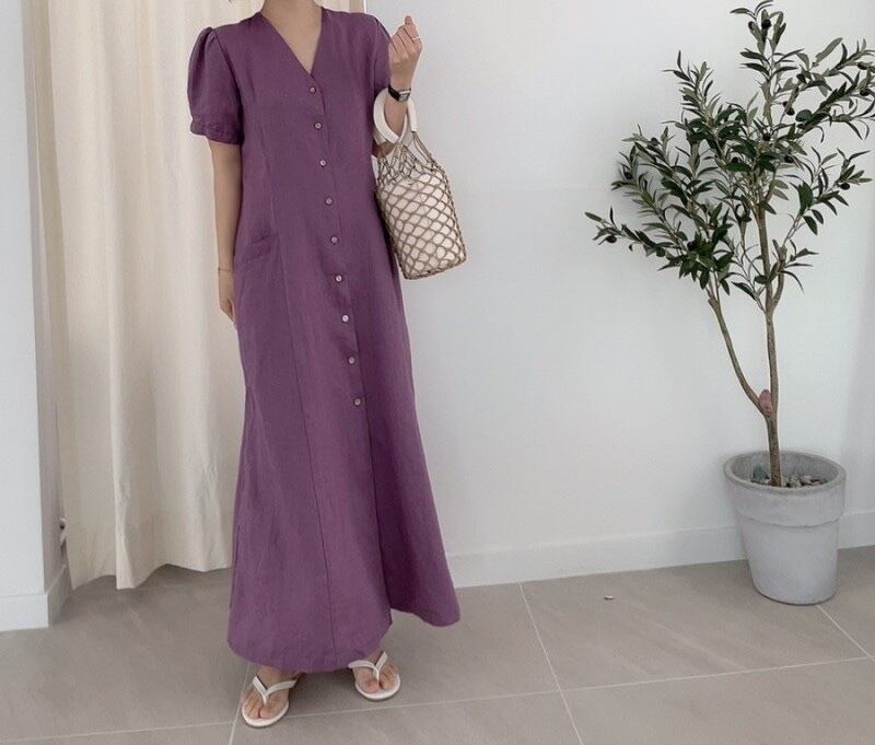 サマースタンダードVネックルーズロングドレス レディース レトロ 夏物 韓国婦人40431638539