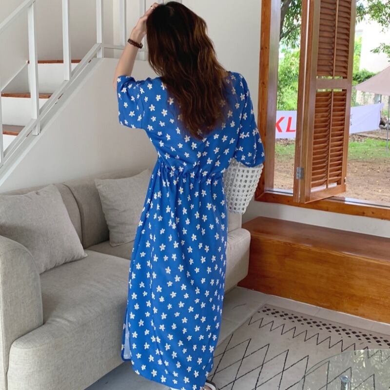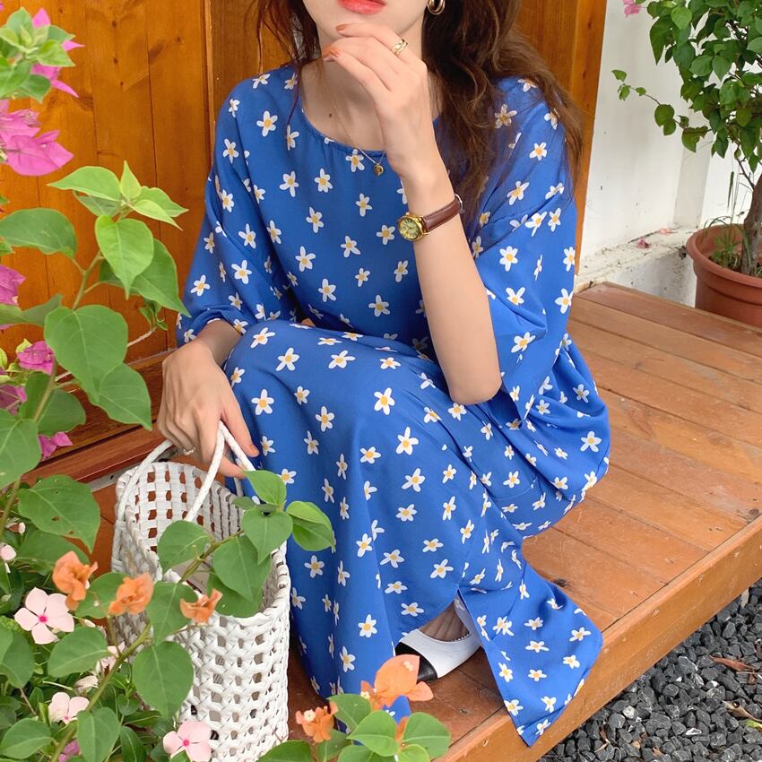 サマーラウンドネックギャザールーズフローラルドレス ロングスカート 夏物 花柄 Oネック 韓国婦人3453275208