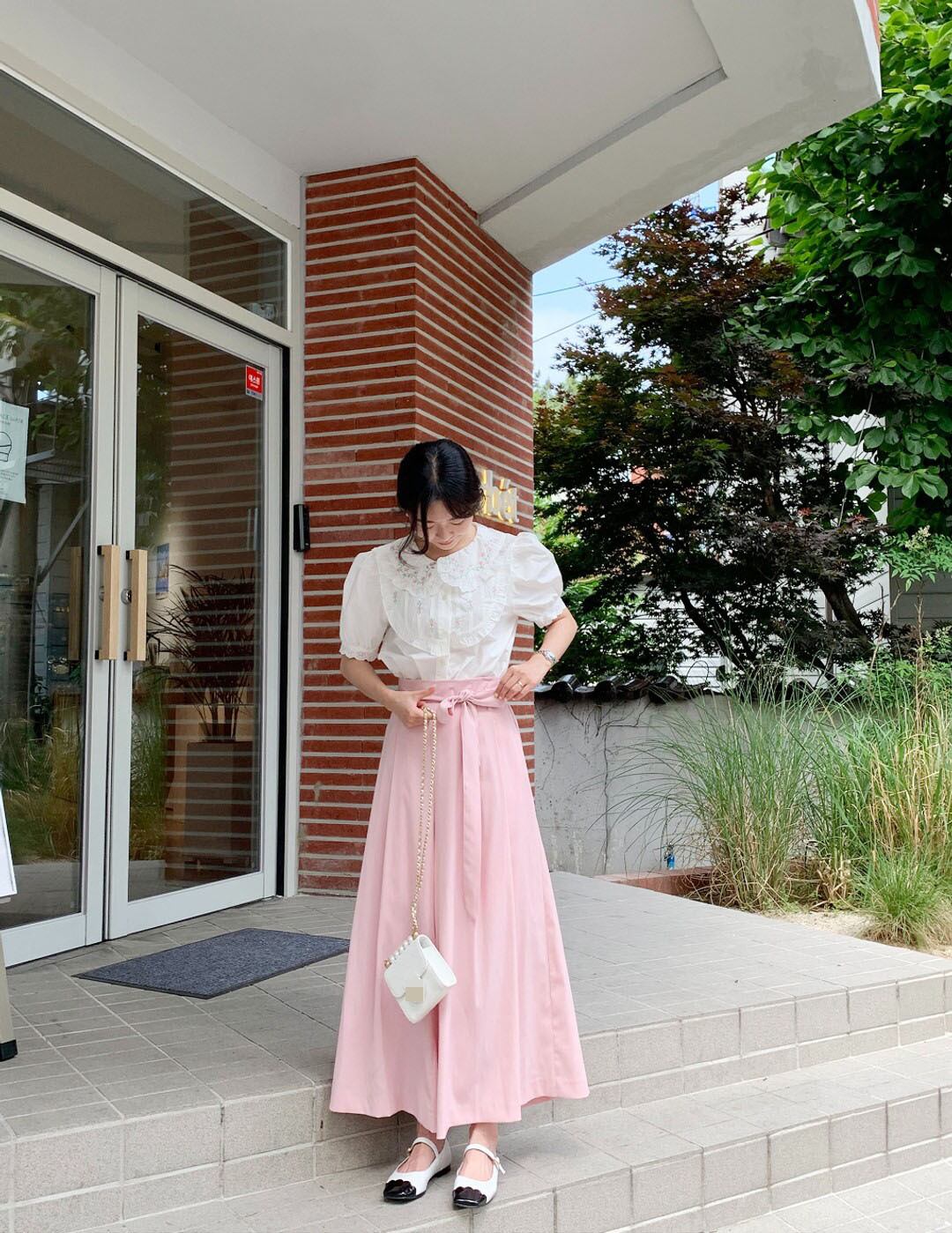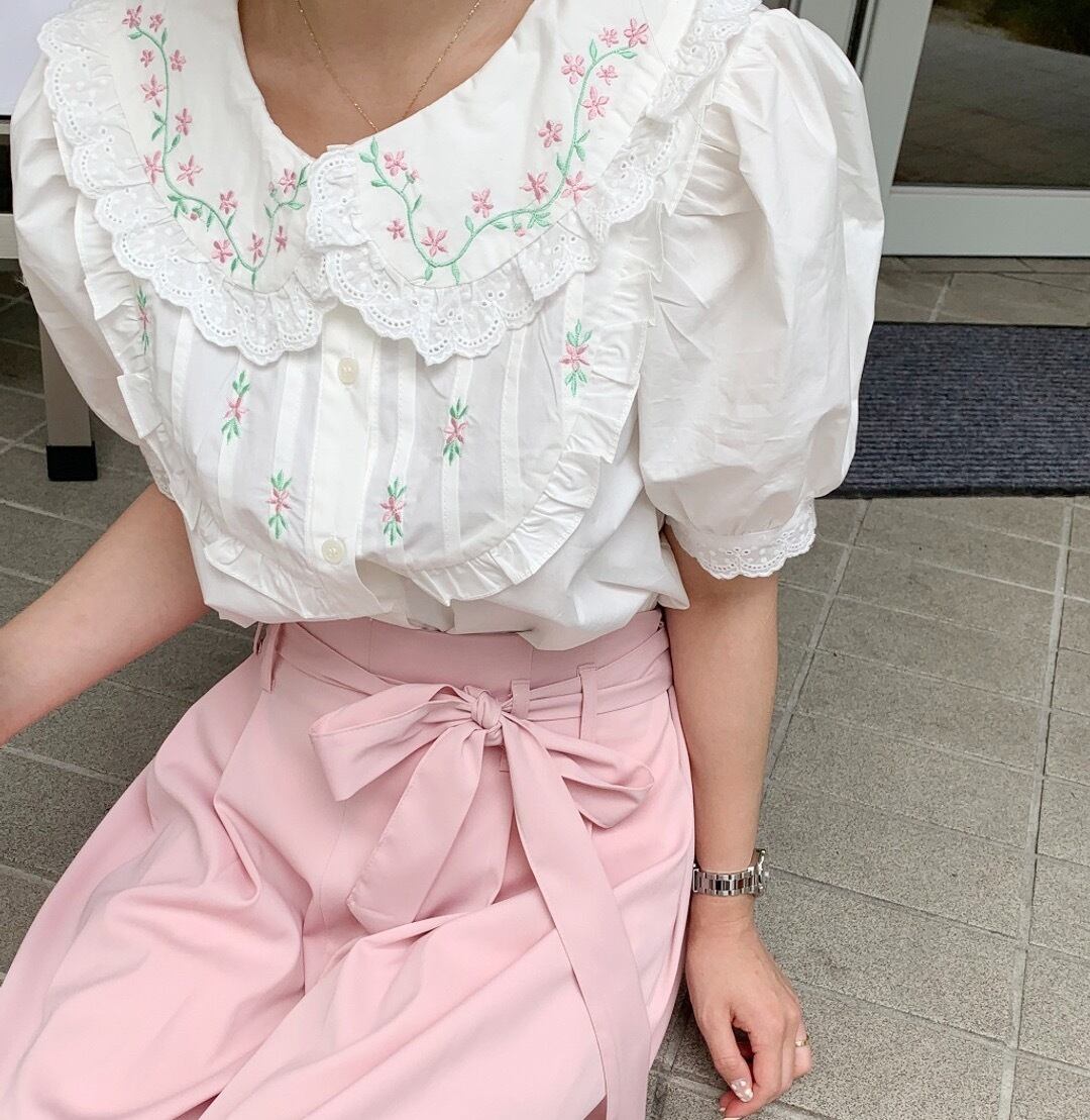 サマーレース刺繍カラーシャツ 大人ガーリー スウィート キュート カジュアル 夏物 ステッチ 韓国婦人43221090996