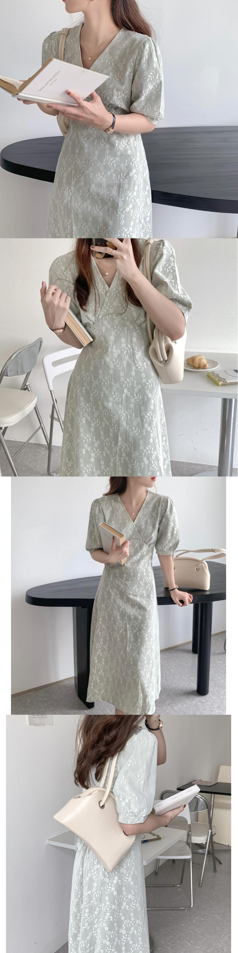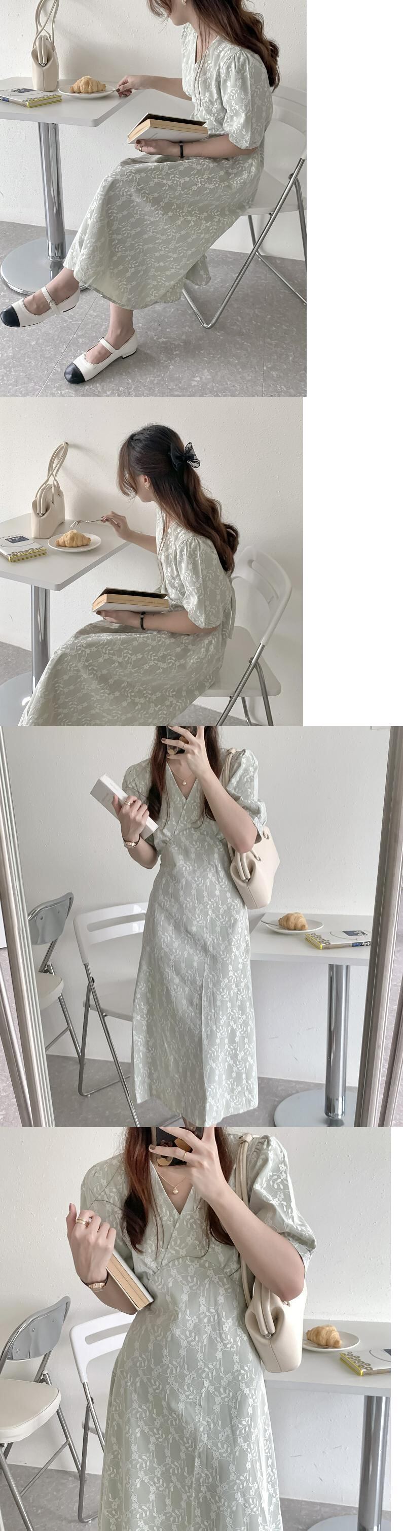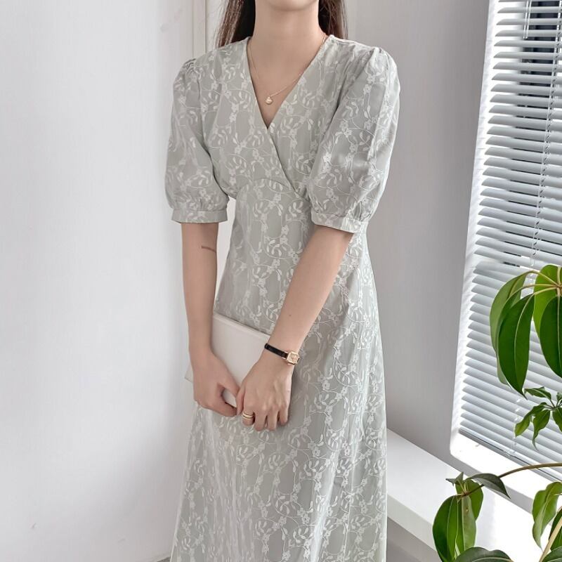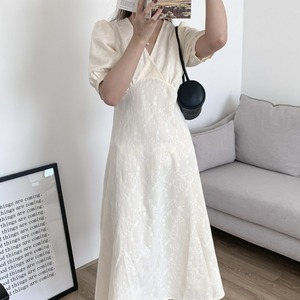 Vネックハイウェストレースジャカードスリーブロングドレス レディース 韓国婦人18124596605