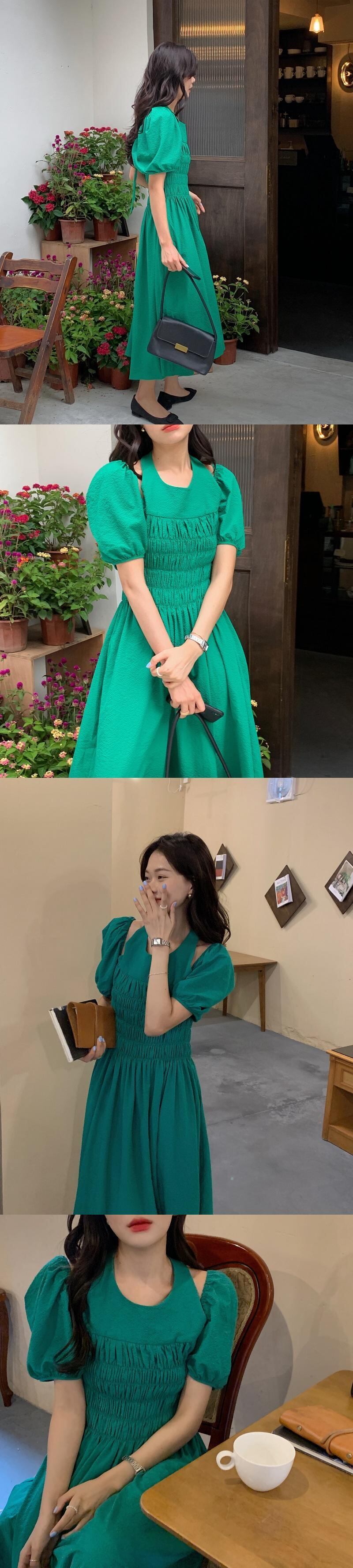サマーストラップレスプリーツスリーブロングドレス 夏物 韓国婦人10036401106