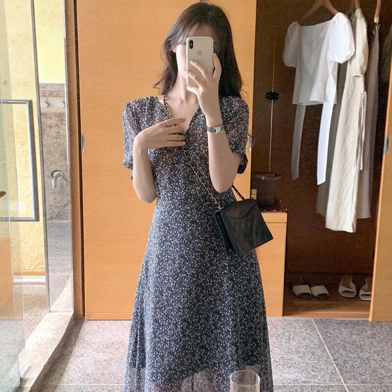 サマーVネックフローラルウェストベルト シフォンドレス 夏物 ハーネス 花柄 韓国婦人92359911426