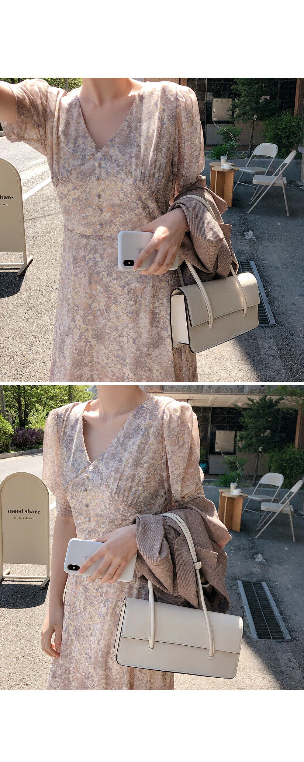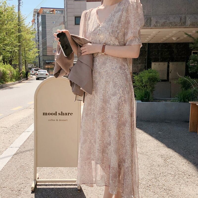 スタンダードフローラルウェストVネックドレス サマーシフォンスカート ロング レトロ 夏物 花柄 韓国婦人21418159764