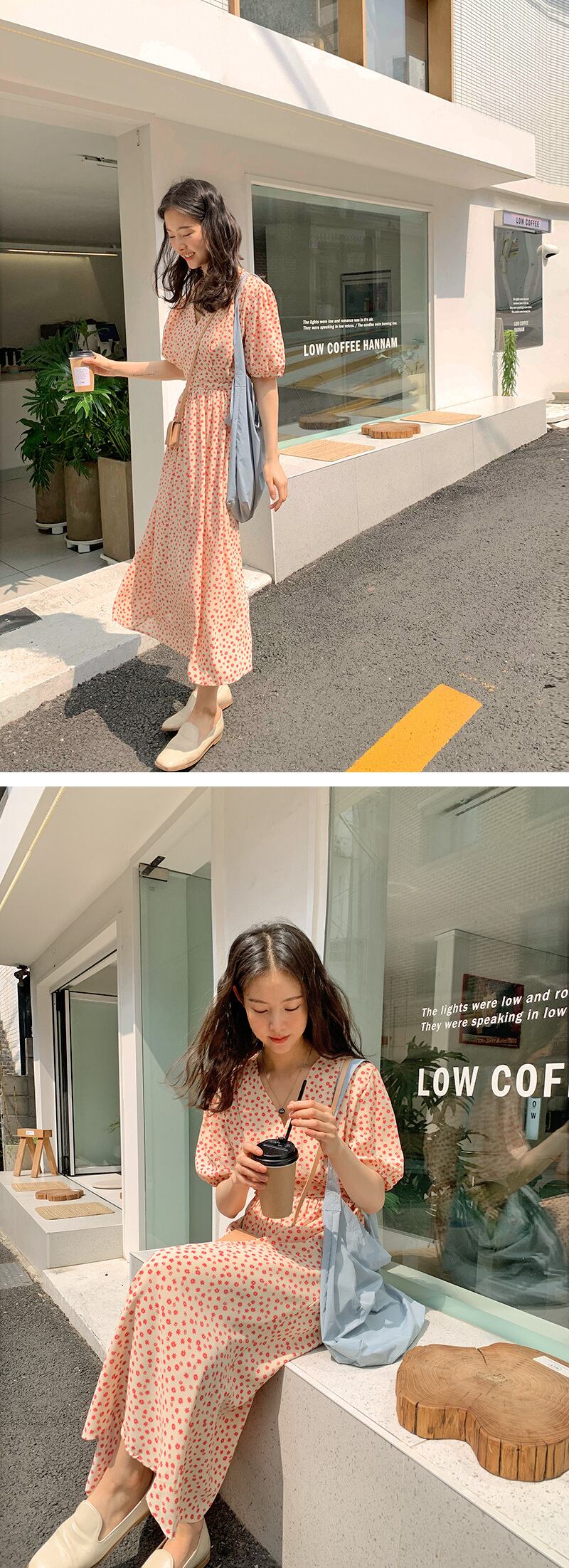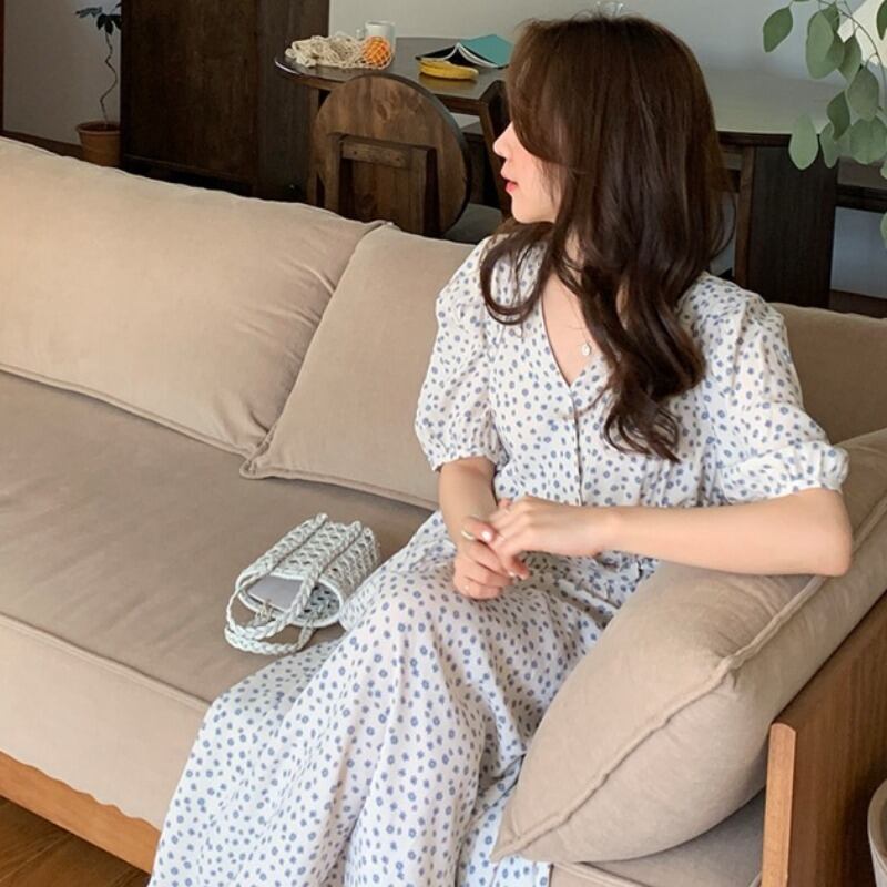サマースタイルVネックフローラルウェストシフォンドレス ロングスカート レース 夏物 花柄 レースアップ 韓国婦人4272565291