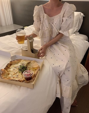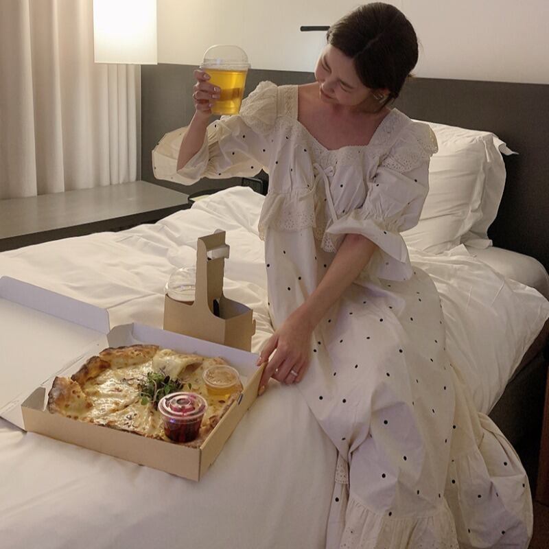 サマーレースカラールーズスリーブ水玉ドレス ロングスカート 夏物 スクウェア ステッチ 韓国婦人80688785676