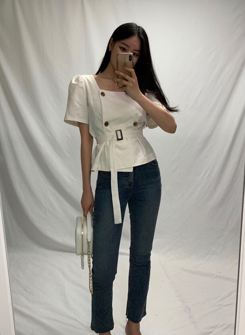 スタイルスタンダードカラーダブルブレストシャツ スリーブウェストショート レトロ スクウェア 韓国婦人69421164927