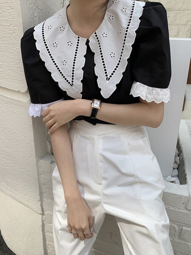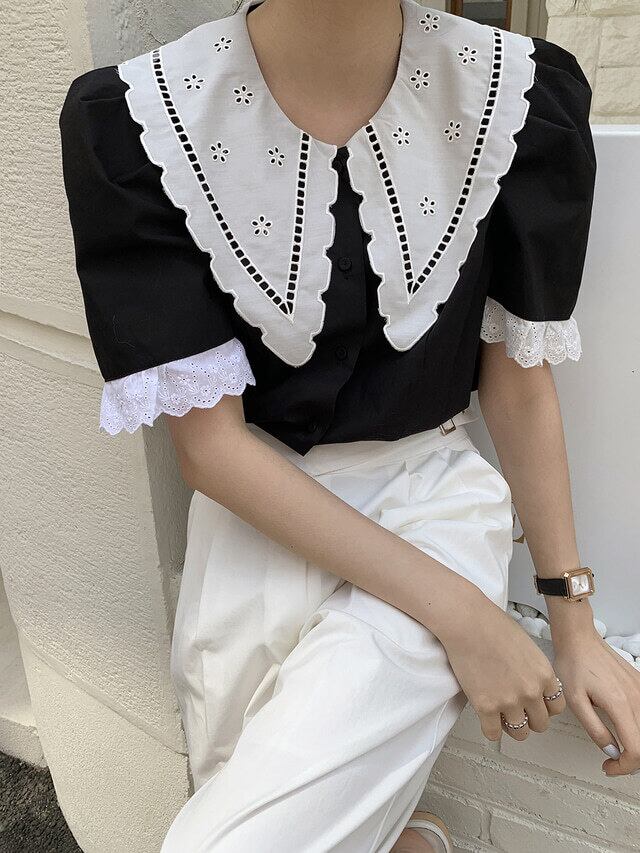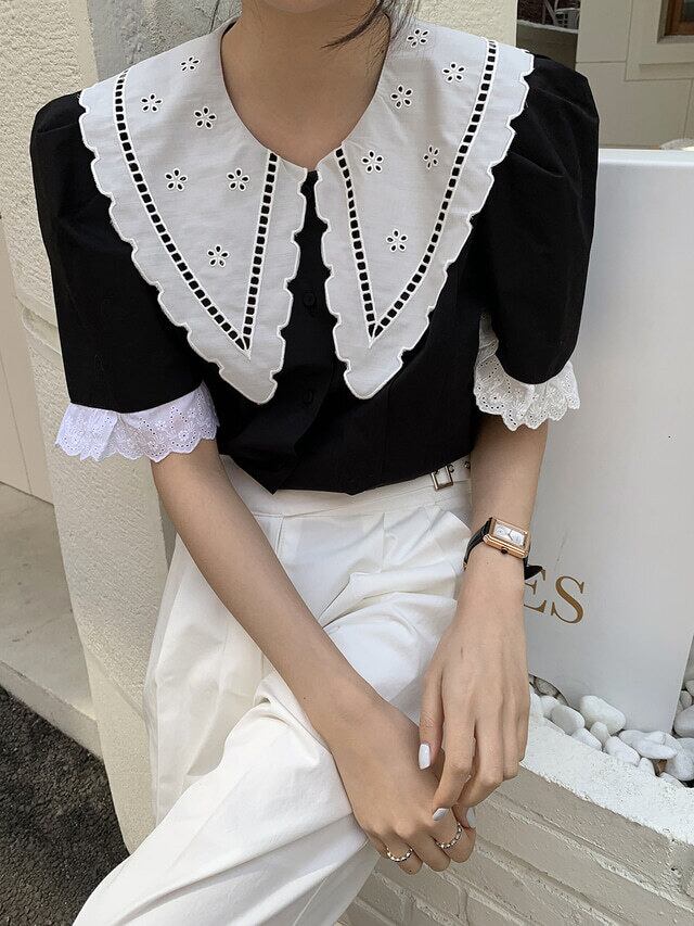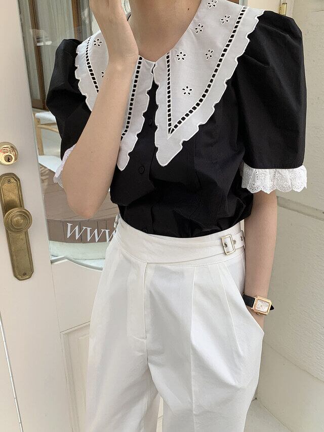 カラースリーブブラウス レディースサマースタイルスタンダードシャツ レトロ 大人ガーリー スウィート キュート カジュアル 夏物 韓国婦人78397521116