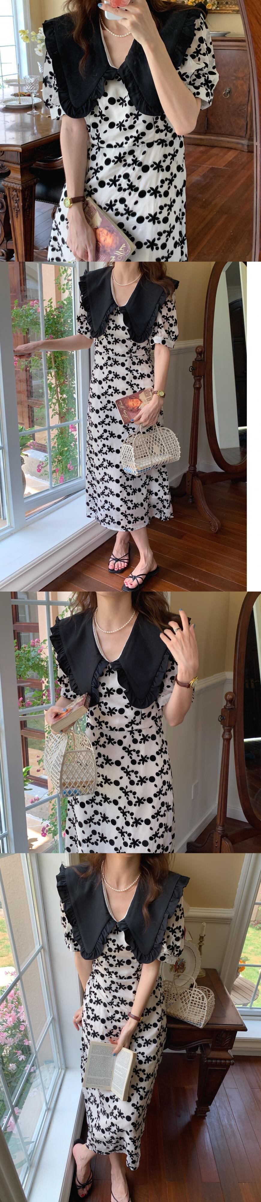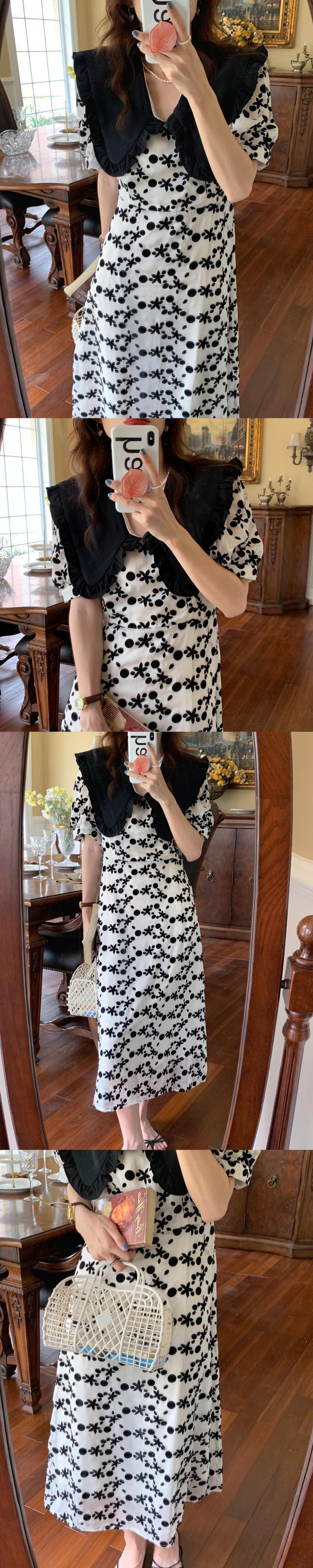 サマースタンダードブラックカラーウェストロングフローラルドレス スカート レトロ 夏物 花柄 韓国婦人63452973444