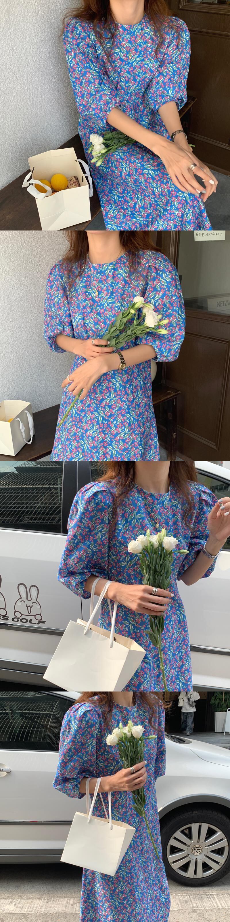 スカート サマードレス スタンダードスリーブラウンドネックルーズ薄手ブルーフローラル レトロ 夏物 花柄 Oネック 韓国婦人29548533836