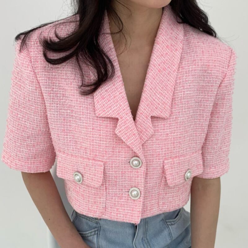 サマーカラーパールルーズツィードショートコート カーディガン 夏物 真珠 韓国婦人8127982458