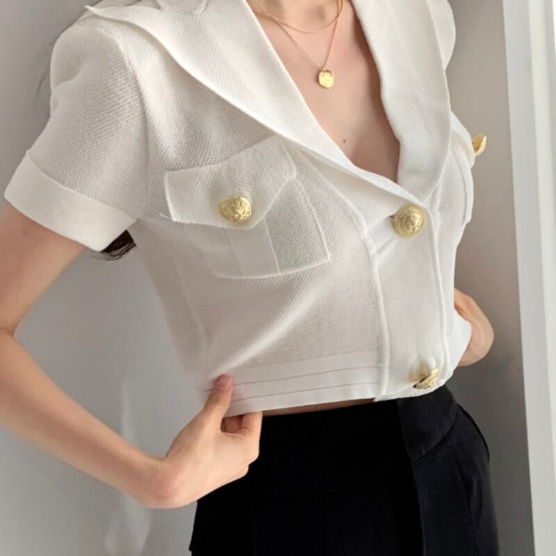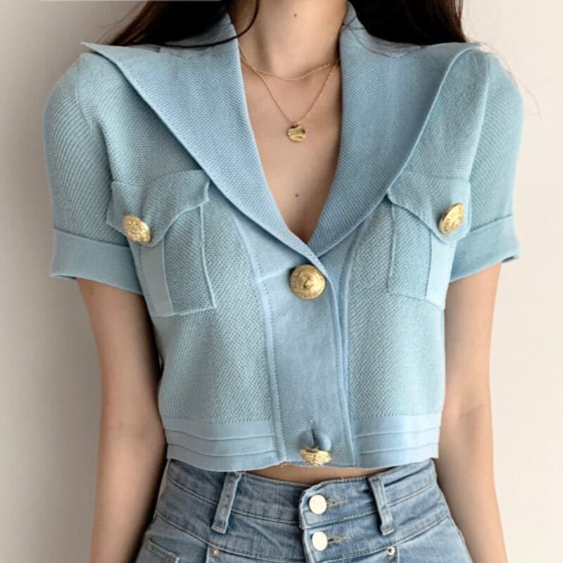 サマーネイビーカラーメタルボタンスリムショートニットセーター トップス レディース 夏物 韓国婦人49335463447