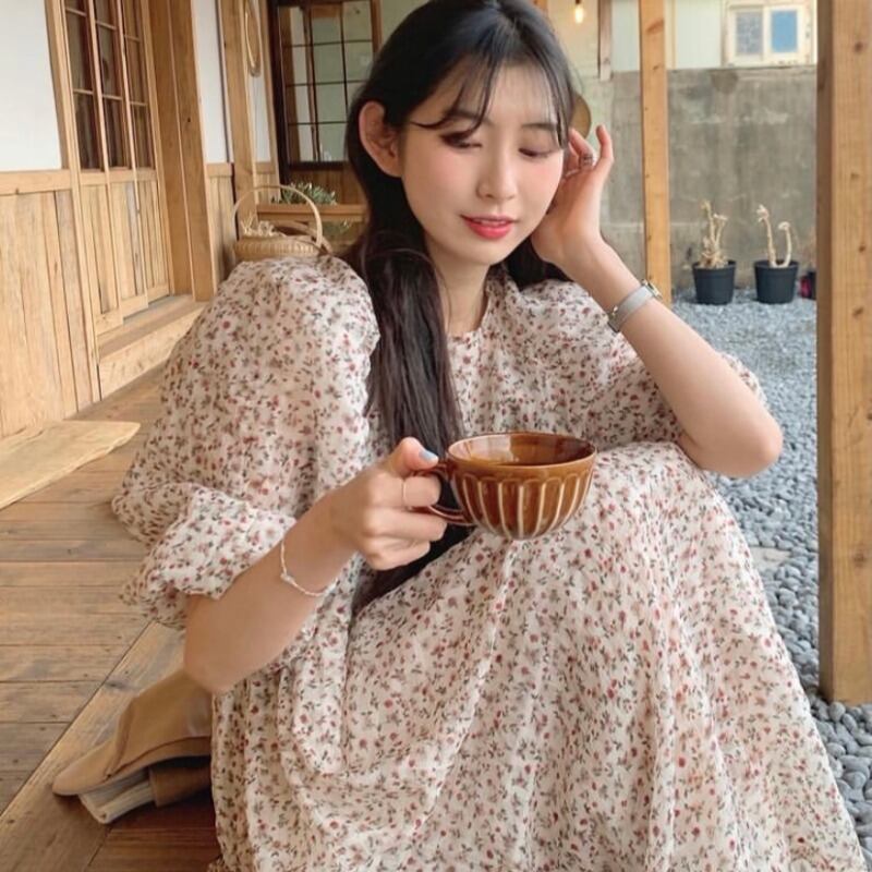 フローラルドレス サマーラウンドネックスリーブシフォンスカート ルーズロング 大人ガーリー スウィート キュート カジュアル エレガント 夏物 花柄 Oネック 韓国婦人66051732549