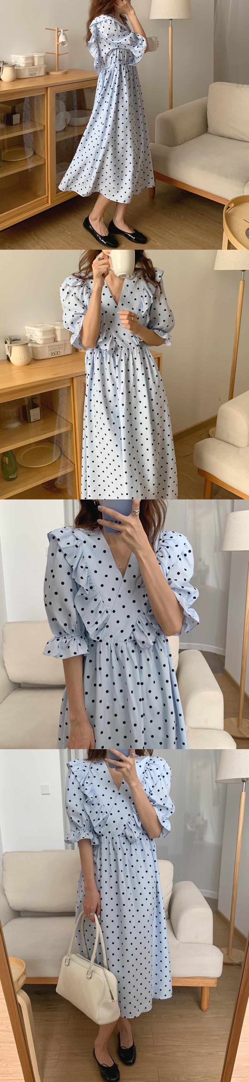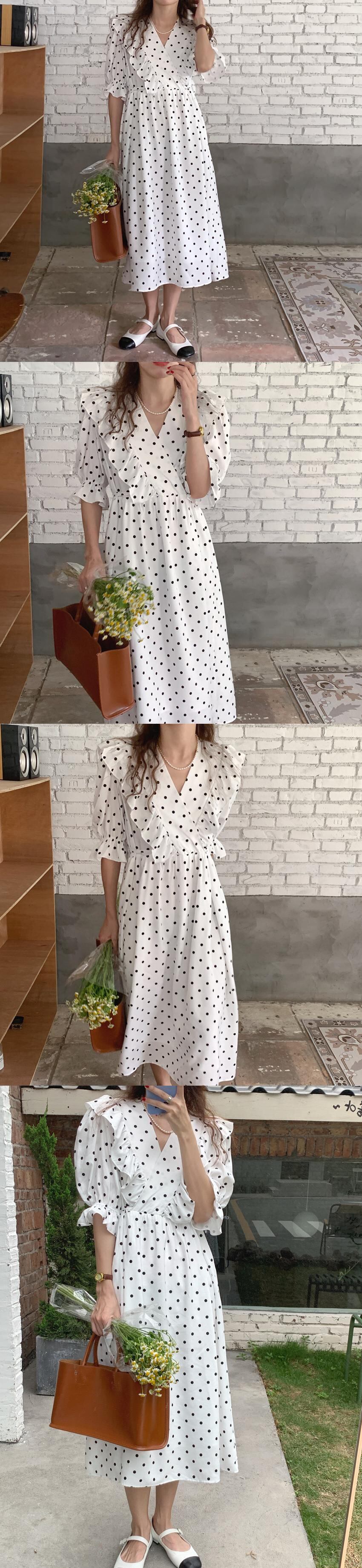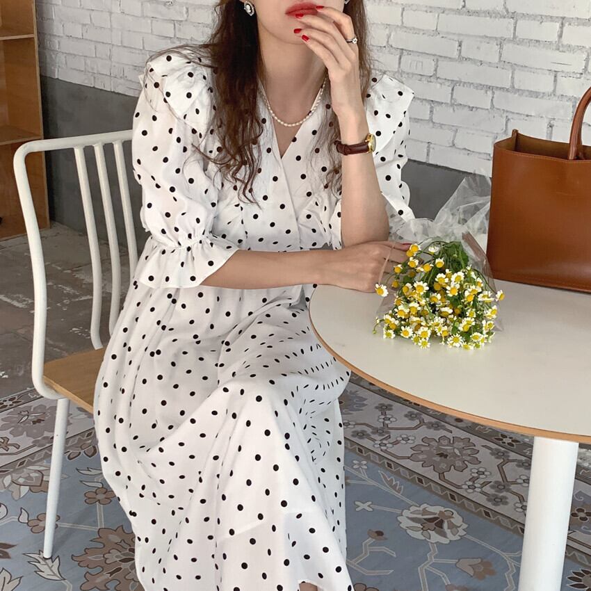 スタンダードVネックラッフル水玉ドレス サマー レトロ 大人ガーリー スウィート キュート カジュアル 夏物 ステッチ 韓国婦人94750397558