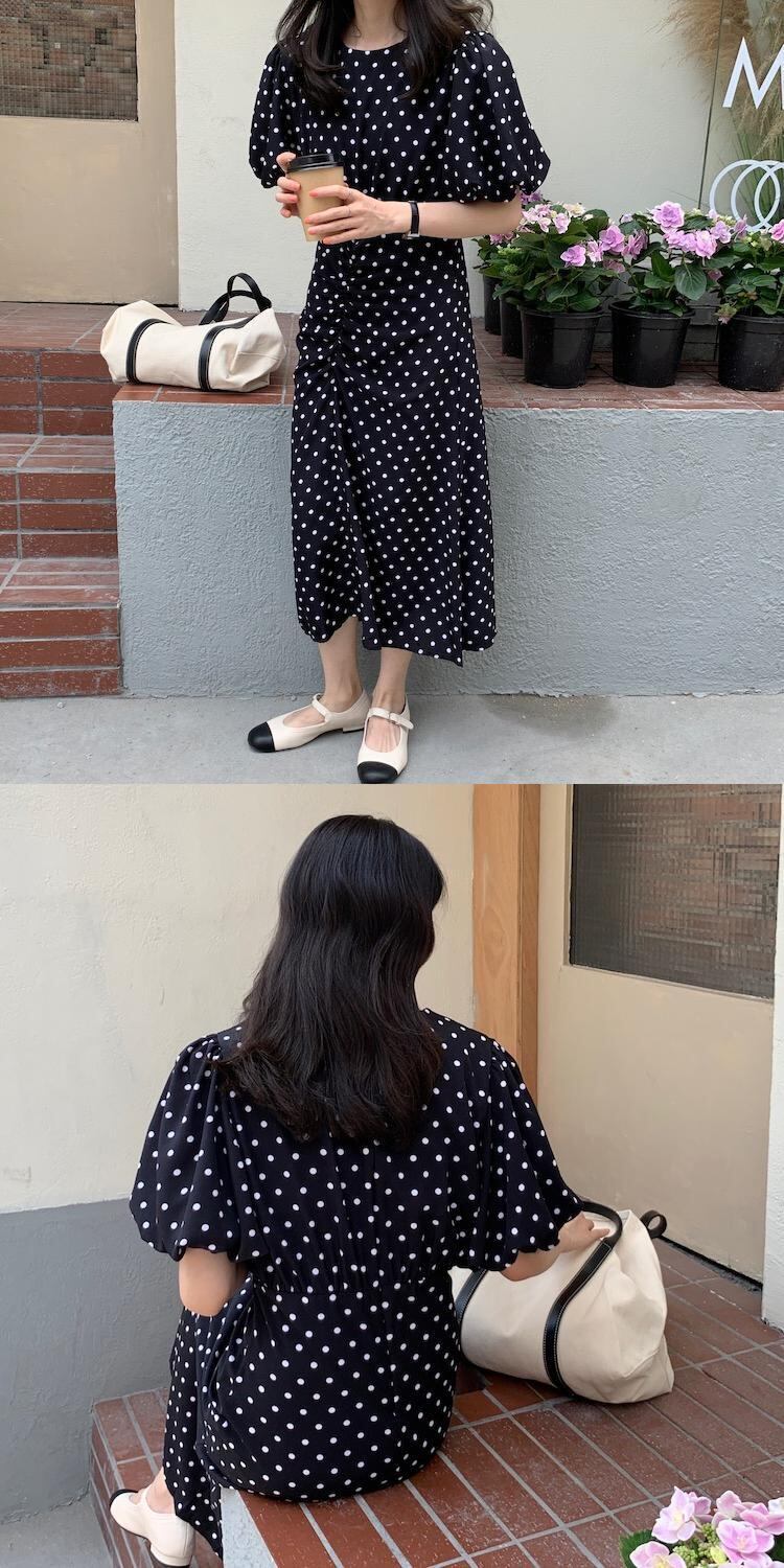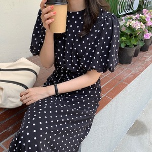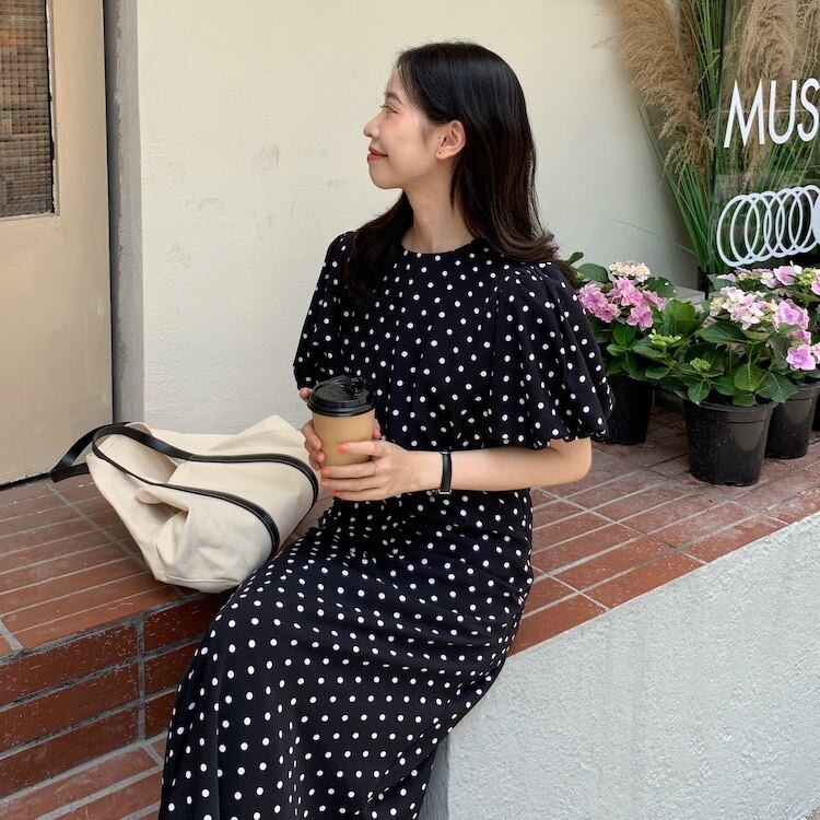 スカート サマースタイルスリーブラウンドネックブラックホワイト水玉ドレス ロング レース 夏物 Oネック 韓国婦人51925078709