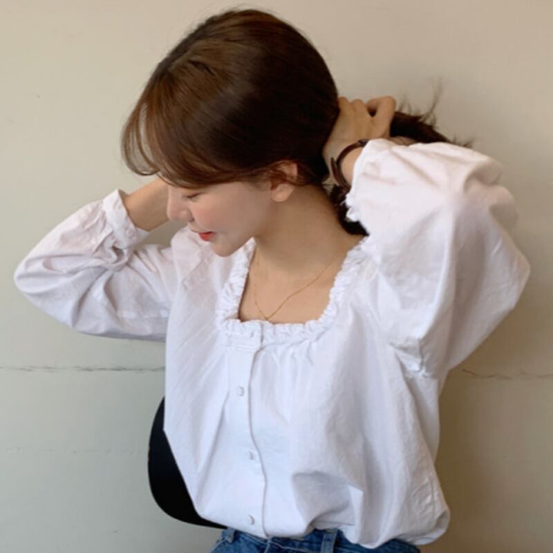 カラーホワイトシャツ レディーススプリングブラウス ロング 大人ガーリー スウィート キュート カジュアル 春物 スクウェア 韓国婦人14692705365