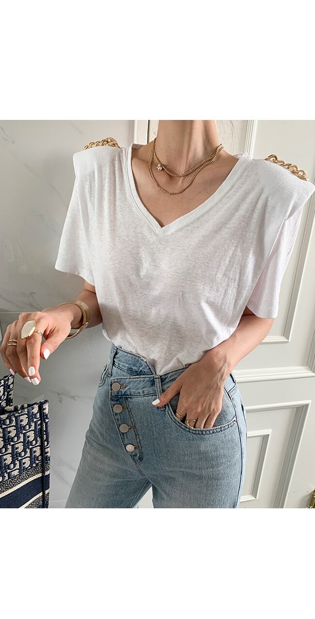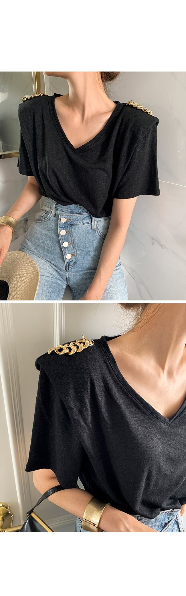 サマーVネックメタルチェーン Tシャツ トップス レディース 夏物 韓国婦人96206457528