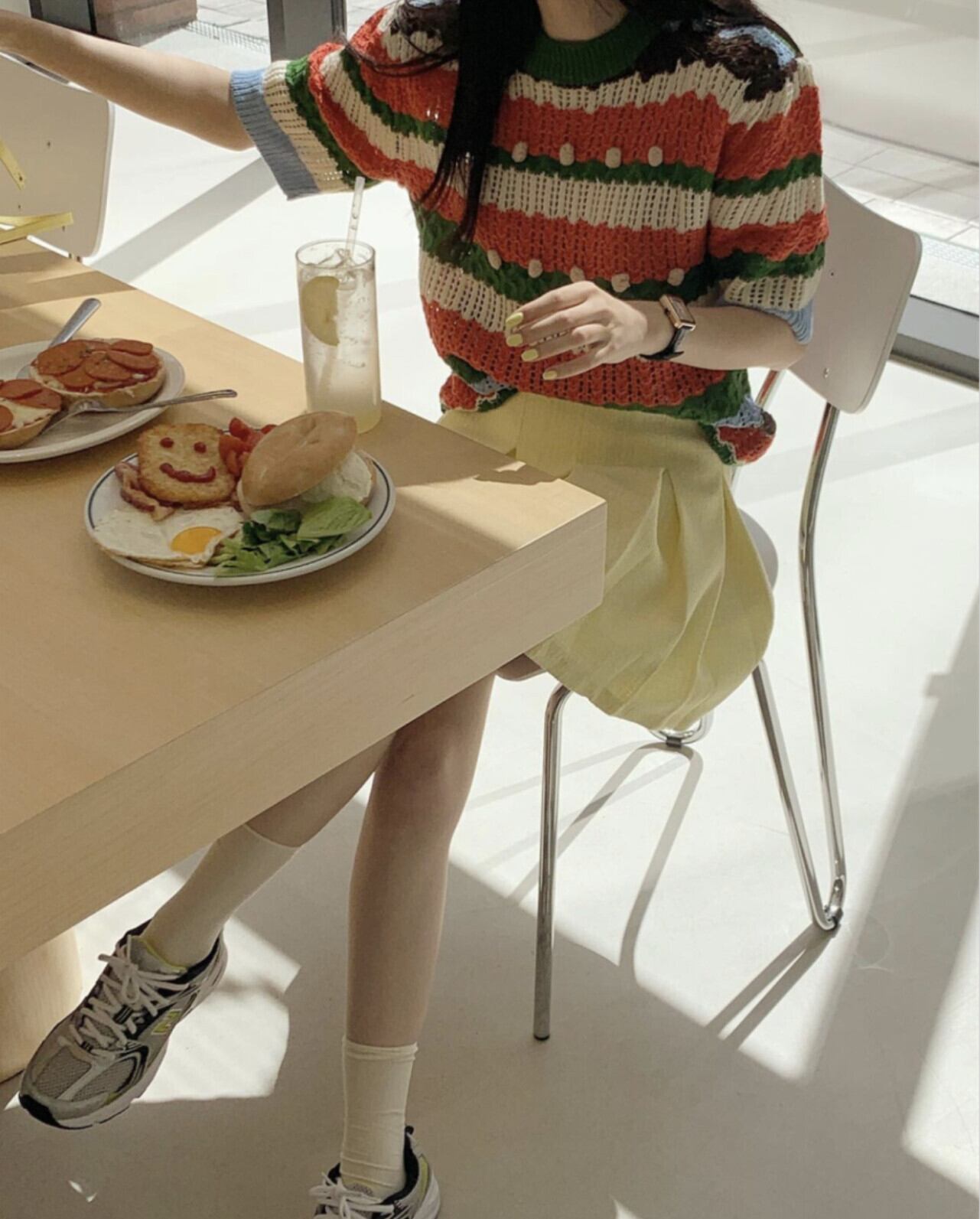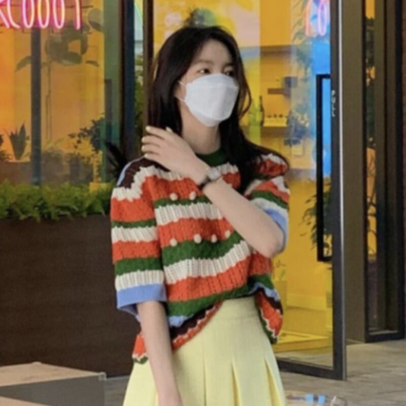 ニットセーター 薄手スタイルファーカラーストライプTシャツ サマートップス 夏物 韓国婦人83068834273