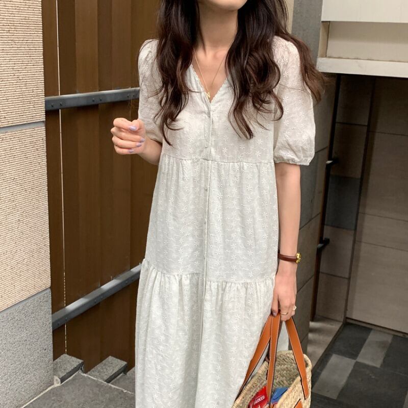 スタンダードVネックレースドレス サマースカート ロング レトロ 夏物 韓国婦人6977513053