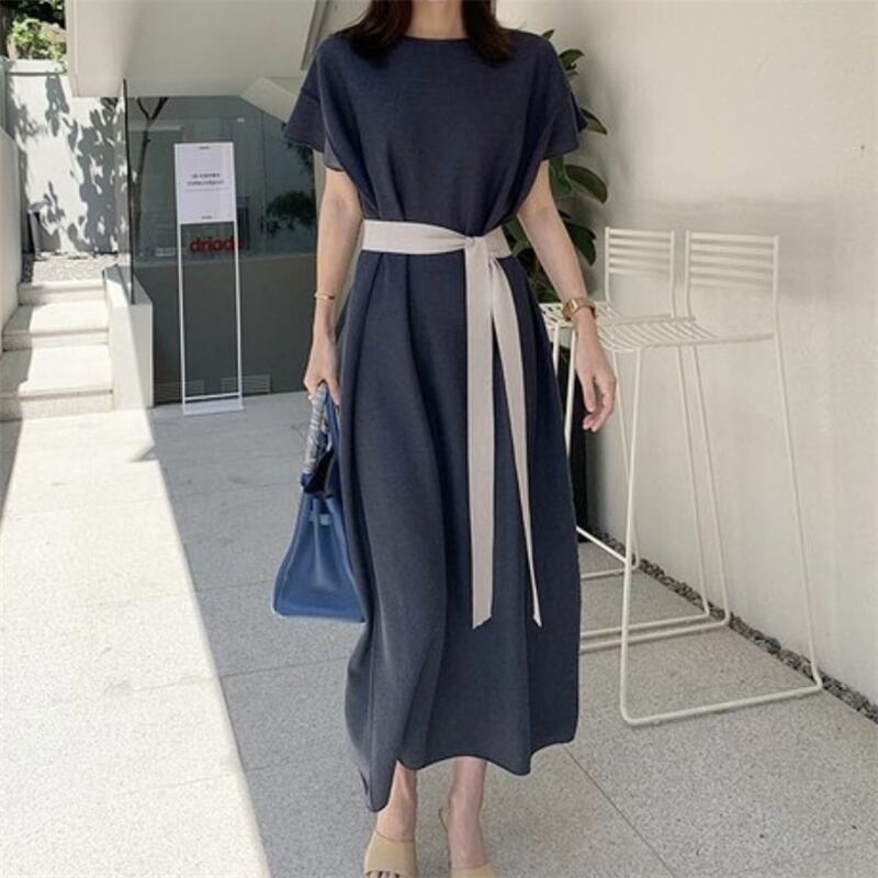 サマースタンダードラウンドネックロング半袖スリーブニットドレス ショート レトロ ハーフスリーブ 夏物 Oネック 韓国婦人66386226663