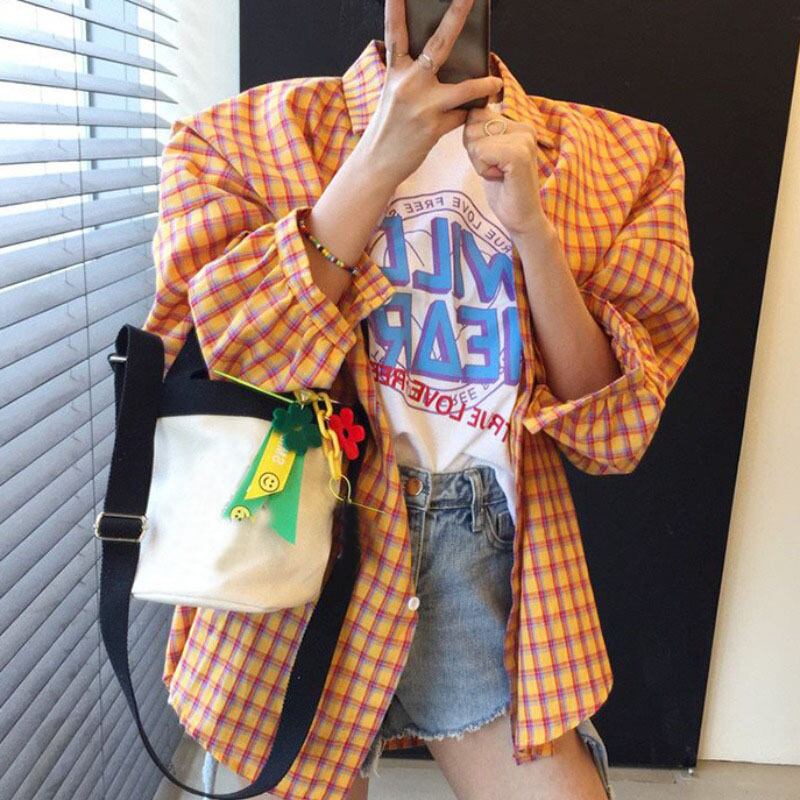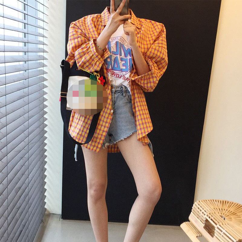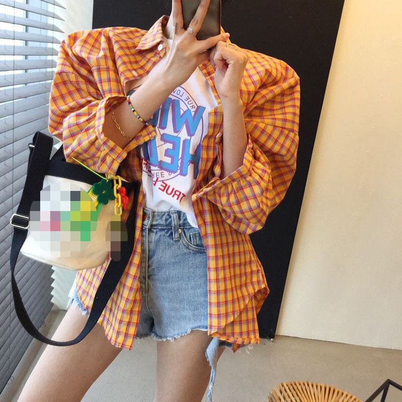 スタンダードカラー格子柄シャツ サマースタイルルーズカジュアルブラウス ロング レトロ 夏物 韓国婦人27263678068