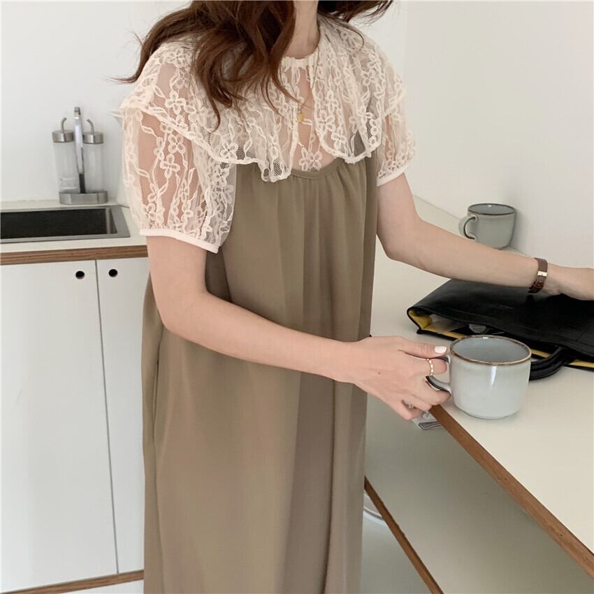 サマーレーススタイルカラーシャツ ロングドレス 夏物 韓国婦人70362422334