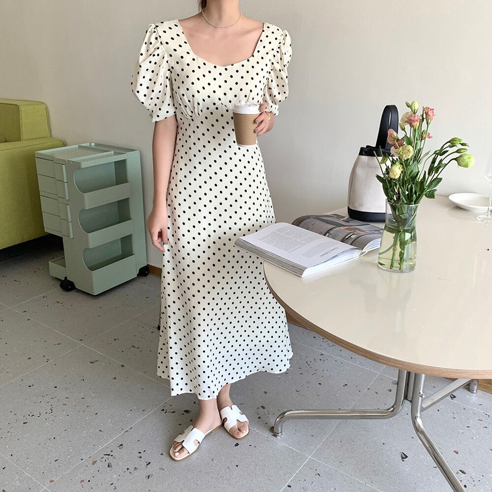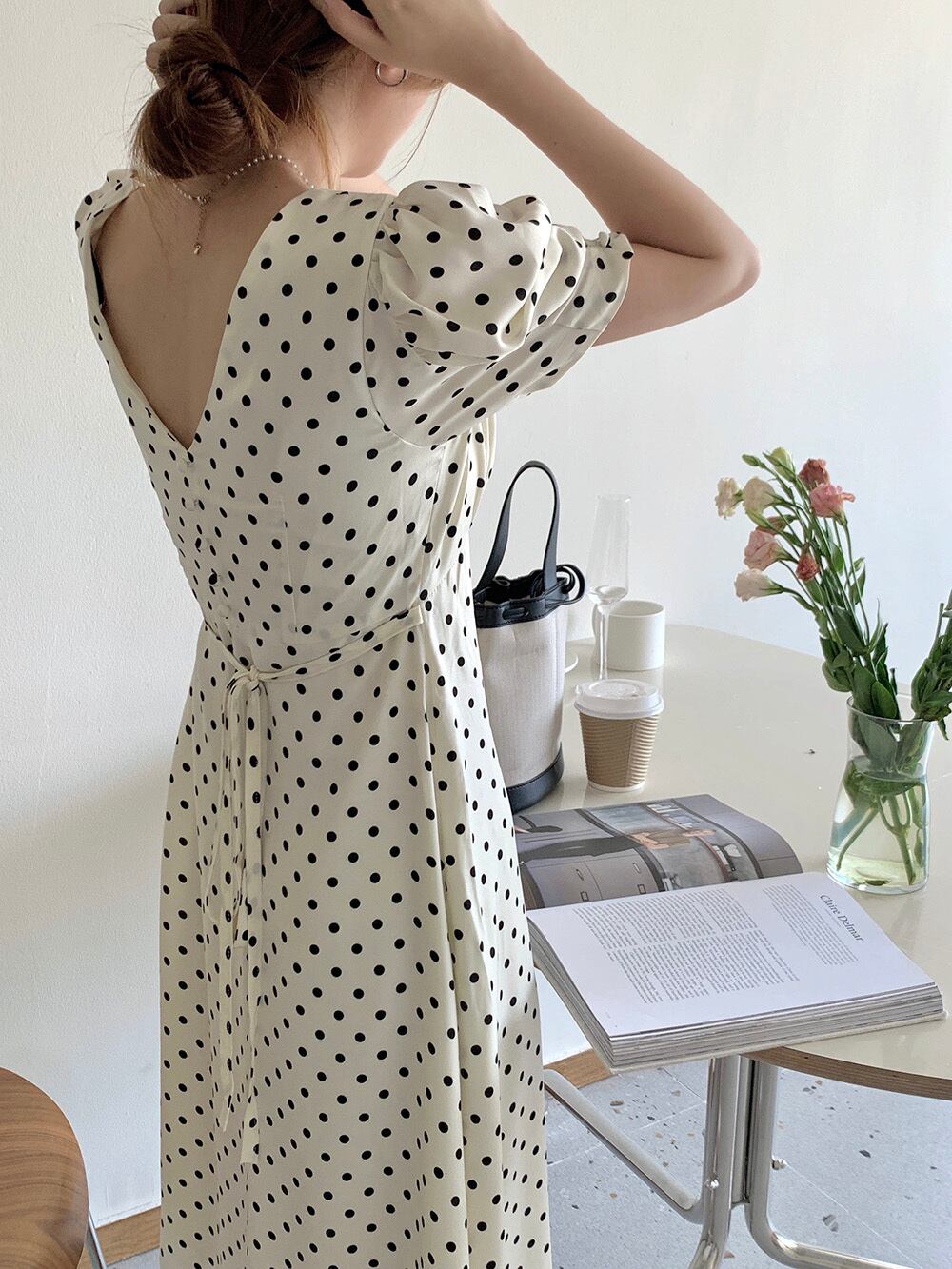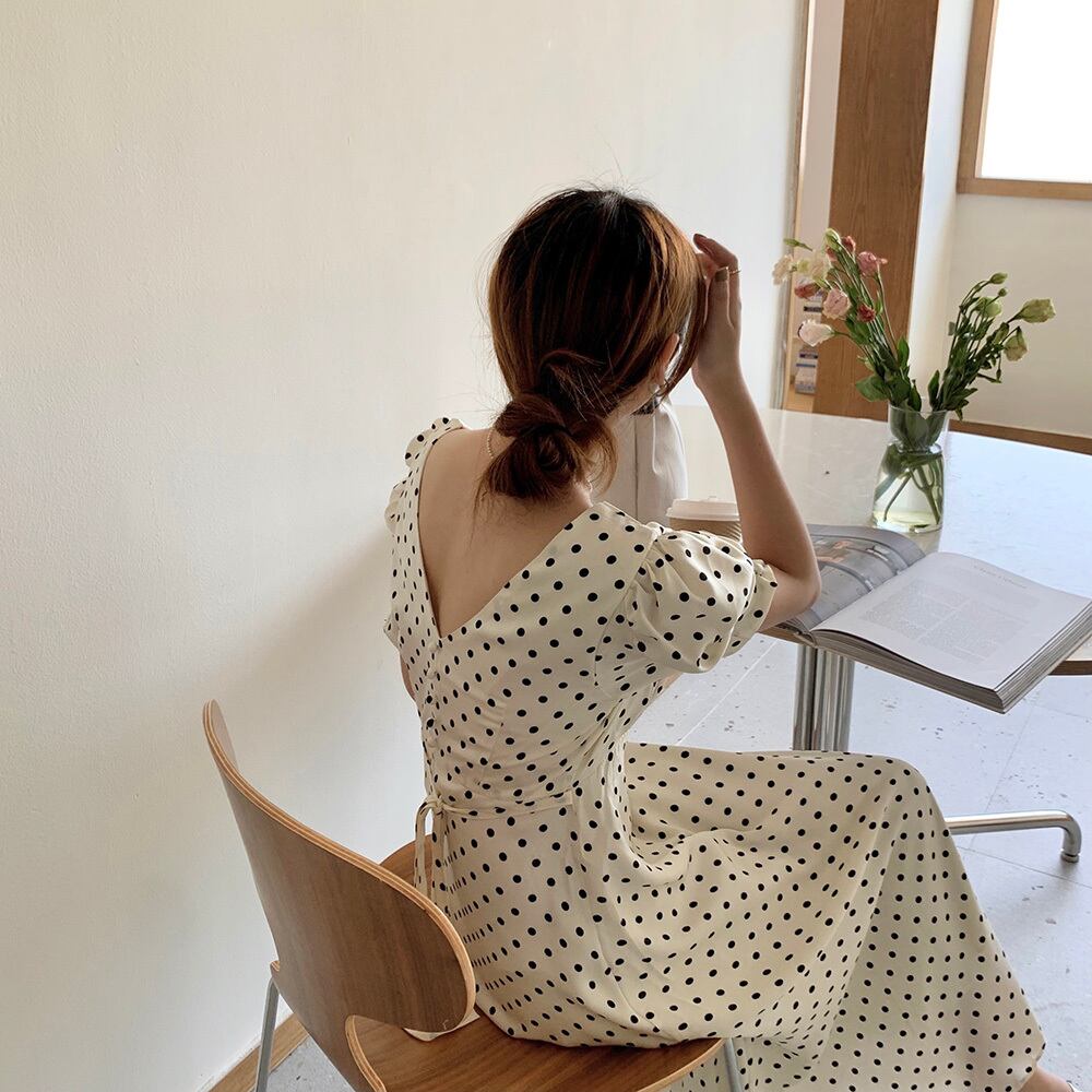 スタンダード水玉ドレス サマースタイルスリーブハイウェストウェスト レトロ レース 夏物 レースアップ スクウェア 韓国婦人22323796275