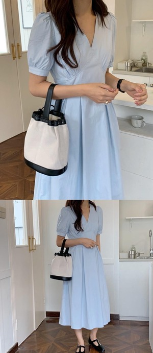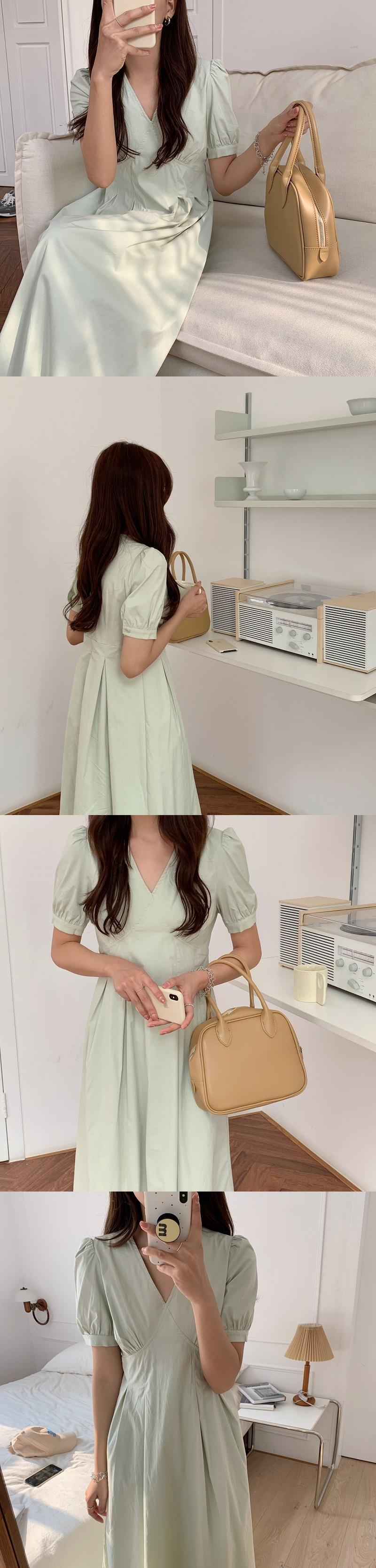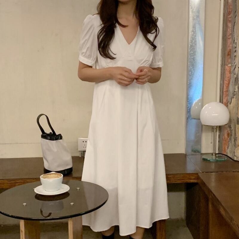 Vネックソリッド カラーウェストスリーブドレス サマープリーツスカート 夏物 ソリッドカラー 韓国婦人37492470484