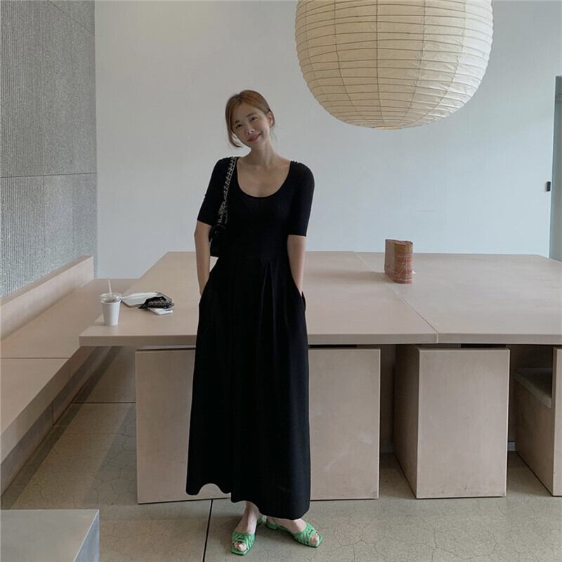 サマーラウンドネックソリッド カラースリムプリーツニットドレス ロングスカート 夏物 Oネック ソリッドカラー ステッチ 韓国婦人56459861174