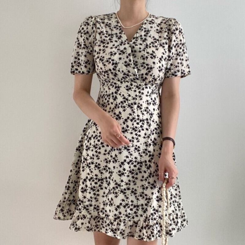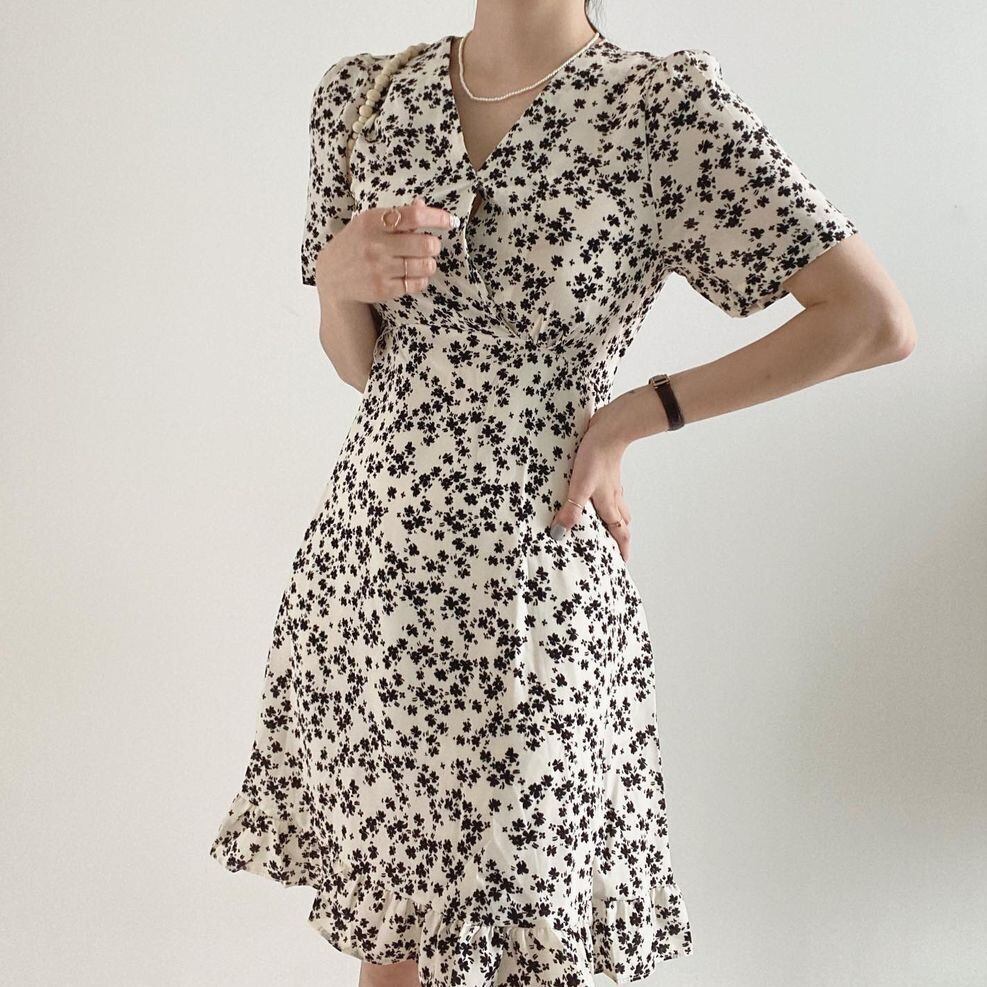サマースタンダードフローラルVネックウェストショートドレス スカート レトロ 夏物 花柄 フラワーデザイン 韓国婦人39174662125