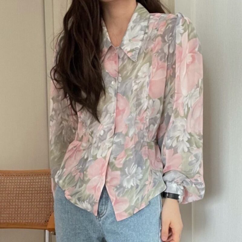 スプリングスタンダードプリントシャツ ルーズスリムブラウス レディース レトロ 春物 韓国婦人81676985897