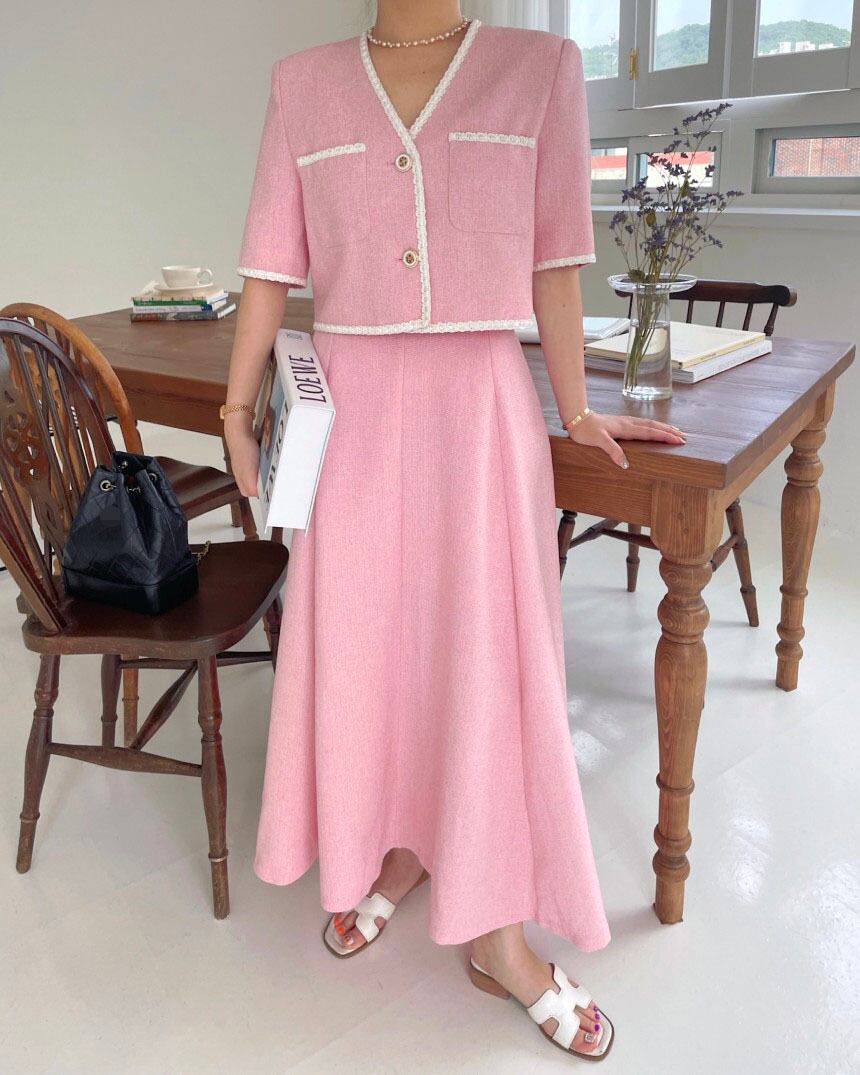 サマーVネックレーストップス Aラインスカート ピンク 大人ガーリー スウィート キュート カジュアル 夏物 韓国婦人69006579900