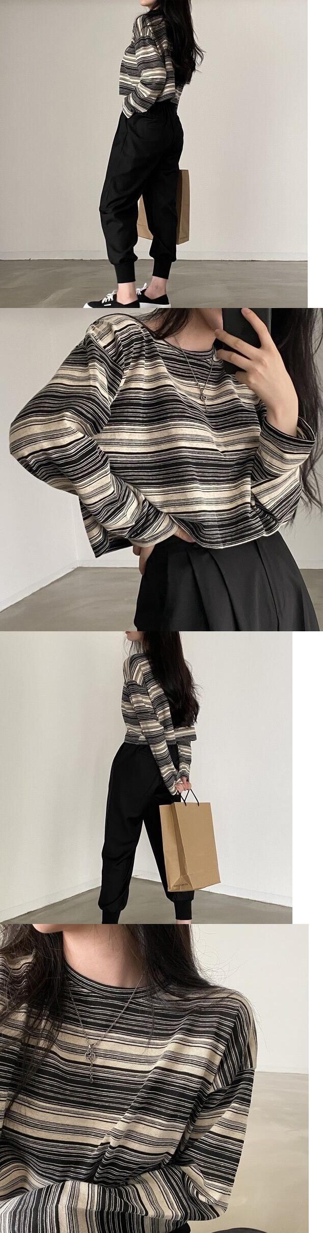 サマースタンダードラウンドネックカラーストライプルーズ薄手ショートTシャツ トップス レディース レトロ 夏物 Oネック 韓国婦人3881716458