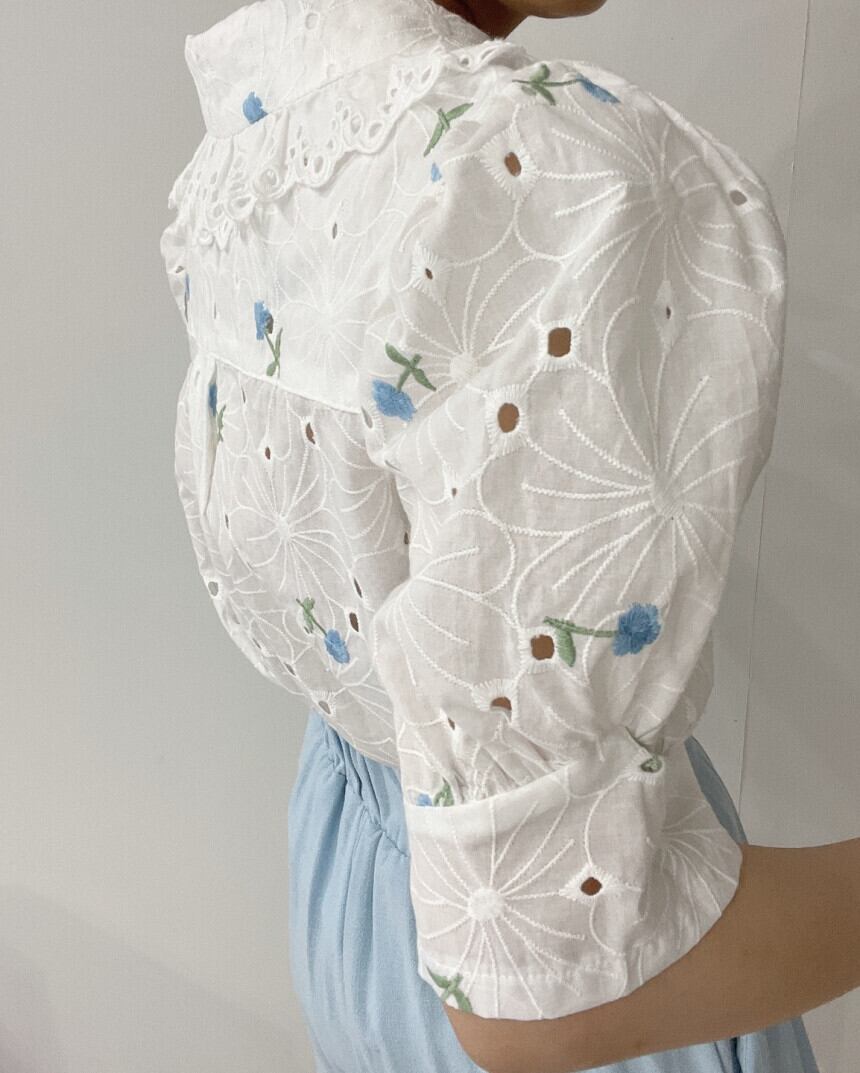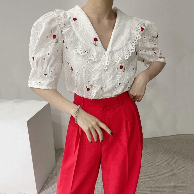 サマーレースシャツ ハイウェストウェストプリーツワイドレッグパンツ レディース レッド 刺繍 夏物 ワイドパンツ 韓国婦人58729623712