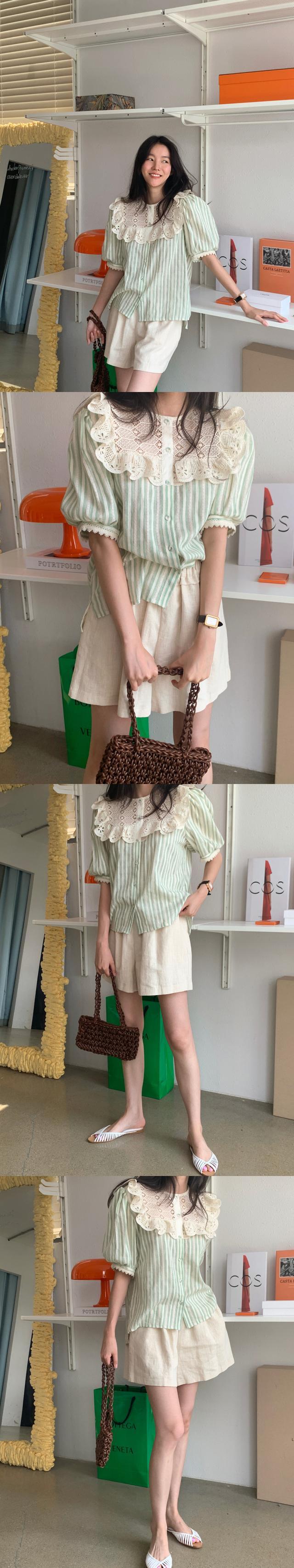 レーススリーブストライプシャツ ルーズトップス サマー 夏物 ステッチ 韓国婦人99230910752