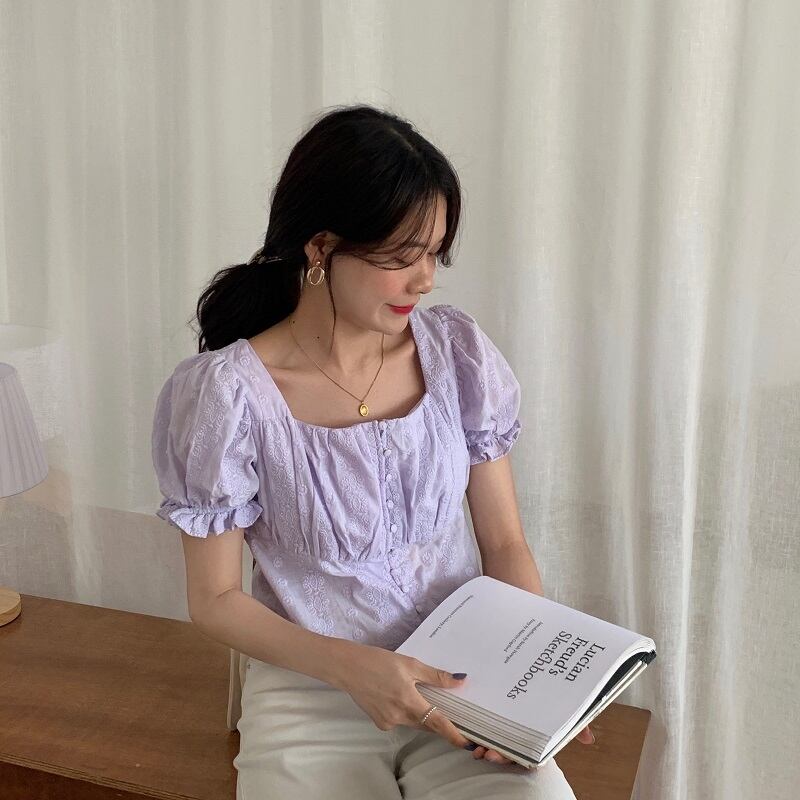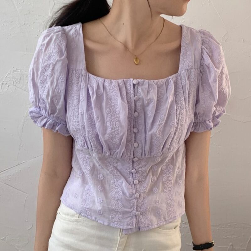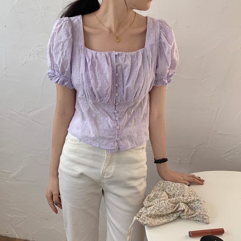 カラーバックスリーブショートシャツ レディースサマーレーストップス レッド 刺繍 大人ガーリー スウィート キュート カジュアル 夏物 スクウェア 韓国婦人20109758397