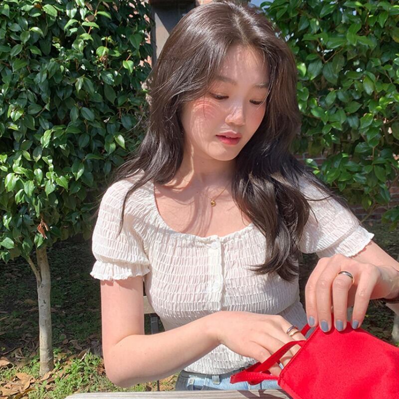 サマープリーツシフォンショートシャツ スタイルボタンスリムトップス 夏物 韓国婦人56329400438