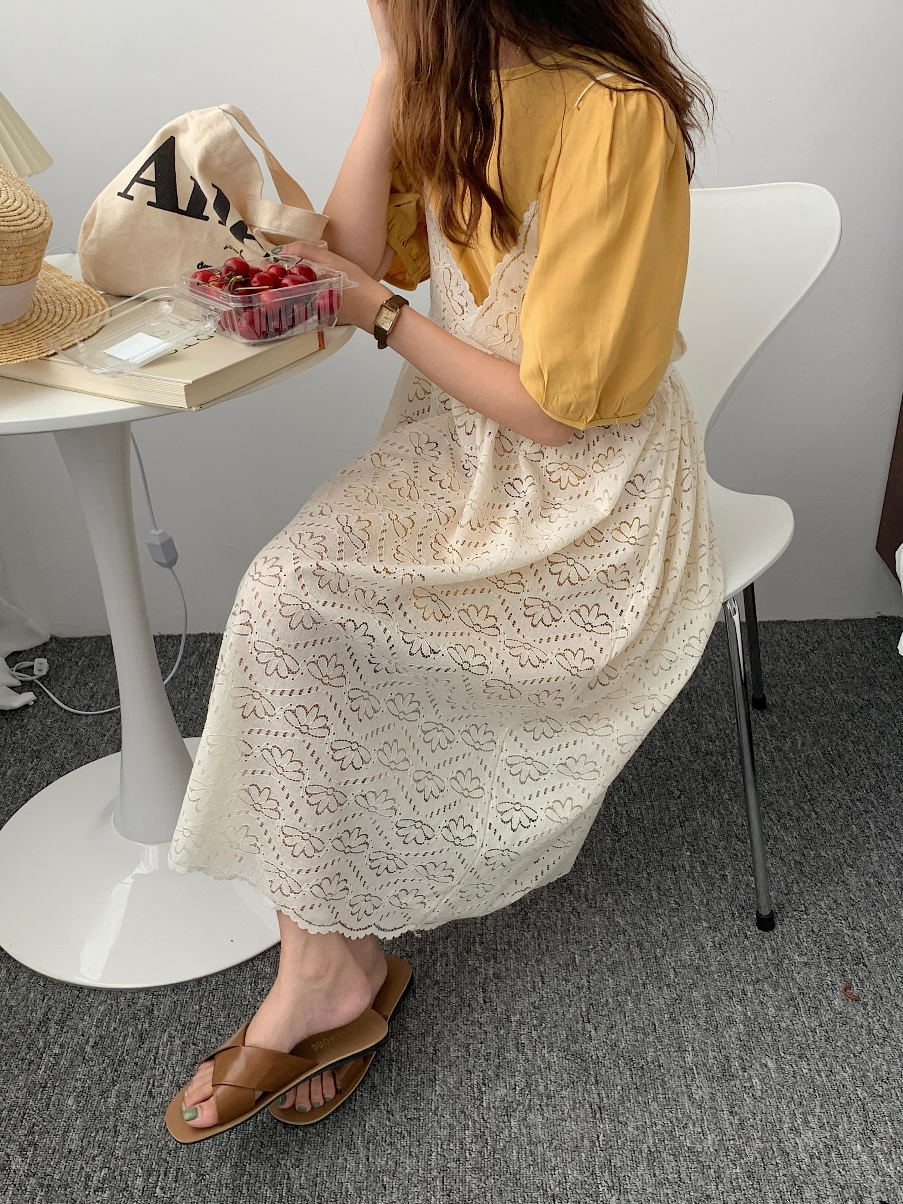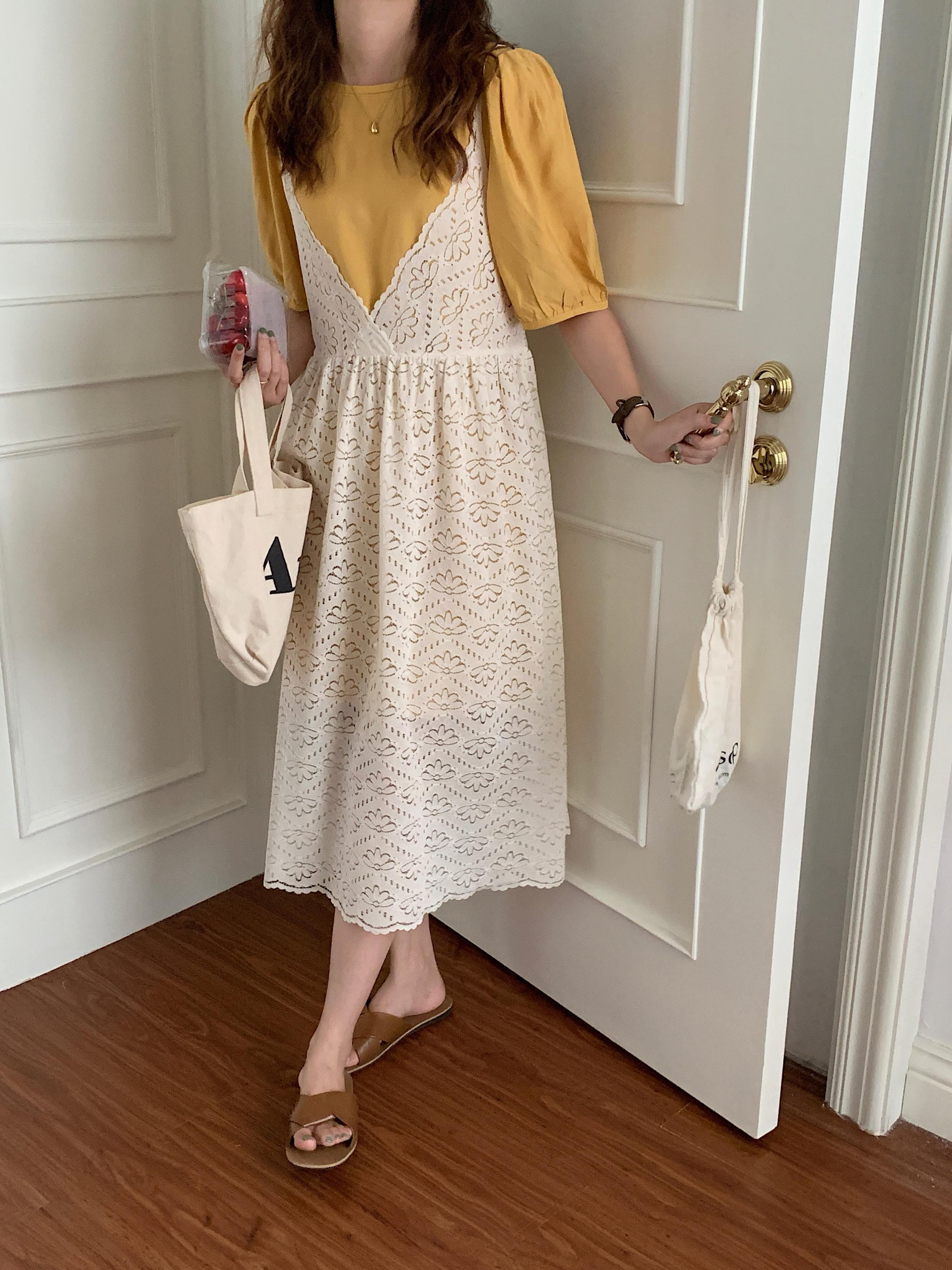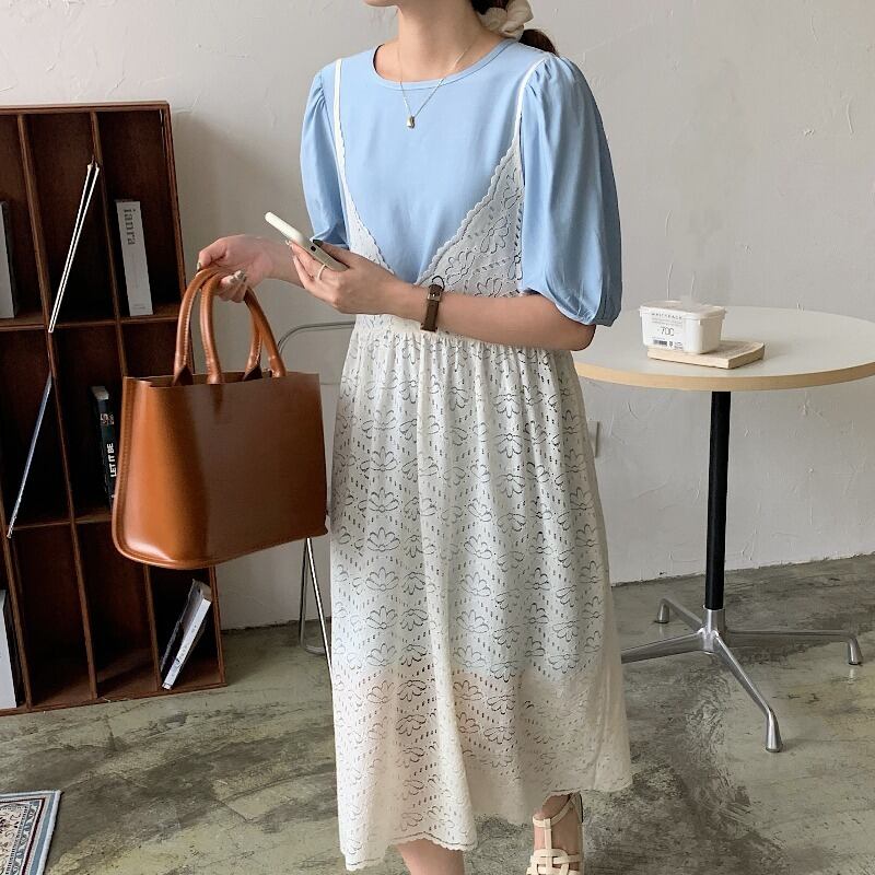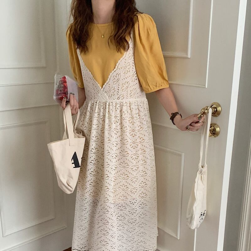 サマーVネックレーススカート スリーブラウンドネックシャツ 夏物 Oネック 韓国婦人90102477116