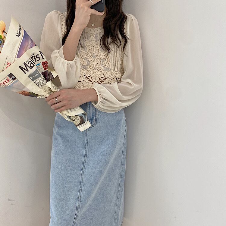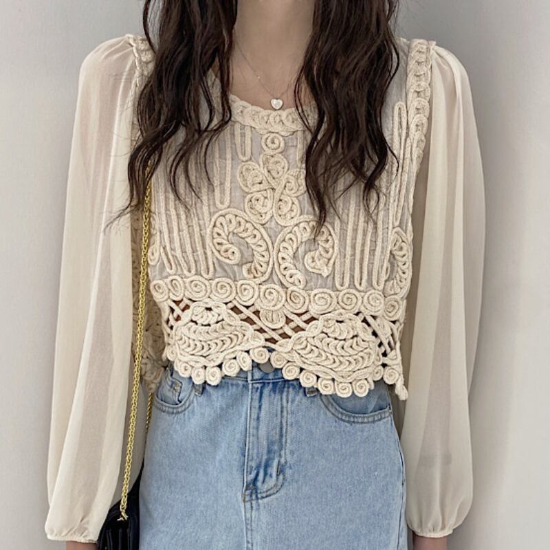 サマーレースシフォンシャツ トップス ロング 大人ガーリー スウィート キュート カジュアル 夏物 ステッチ 韓国婦人7366032781